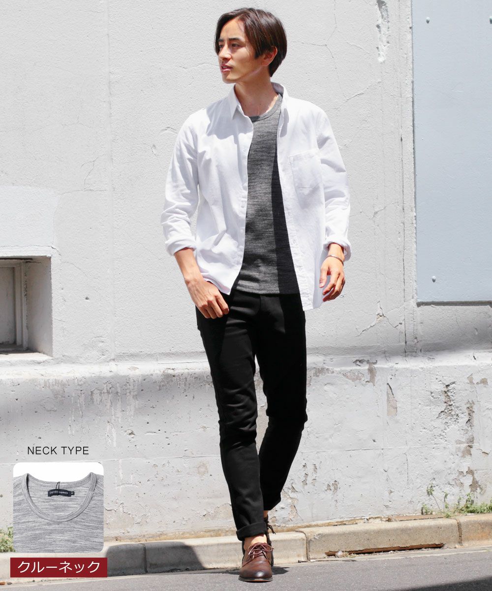 用いている生地は一般的に『リブ』とも呼ばれる、伸縮性に優れたニット地『フライス』です。抜群の伸縮性を持つこの生地によって、一枚で着用してもカッコよく決まる細身の美しいシルエットが形成されます。