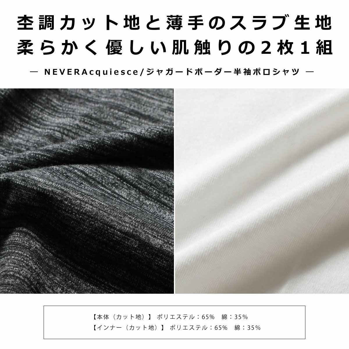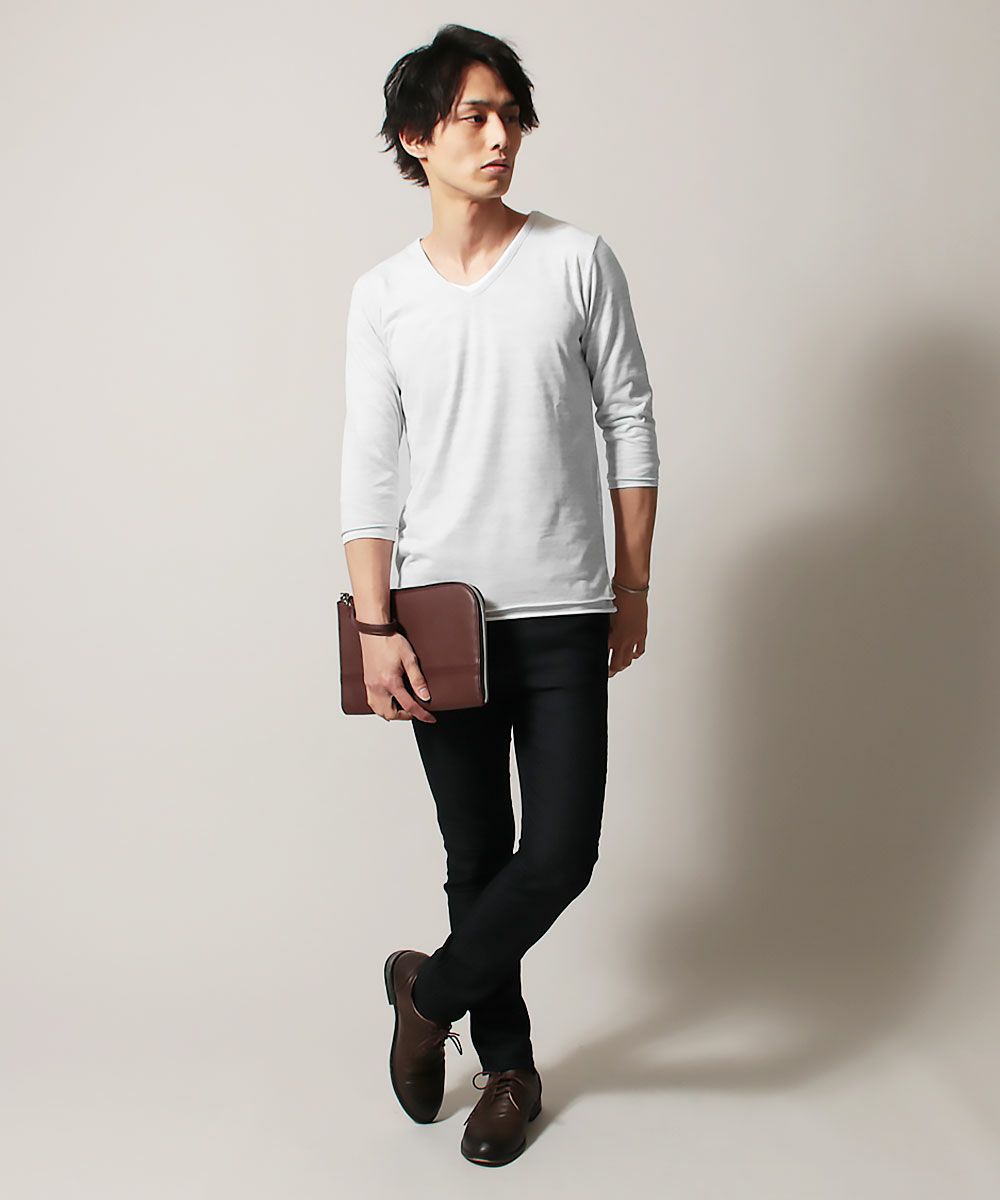 本体のほうはお洒落な印象を与える表情豊かな杢調のカット地。インナーには優しい肌触りが心地良いホワイトのスラブ生地を用いております。2枚重ねて着てもごわつかない薄手のカット地です。
