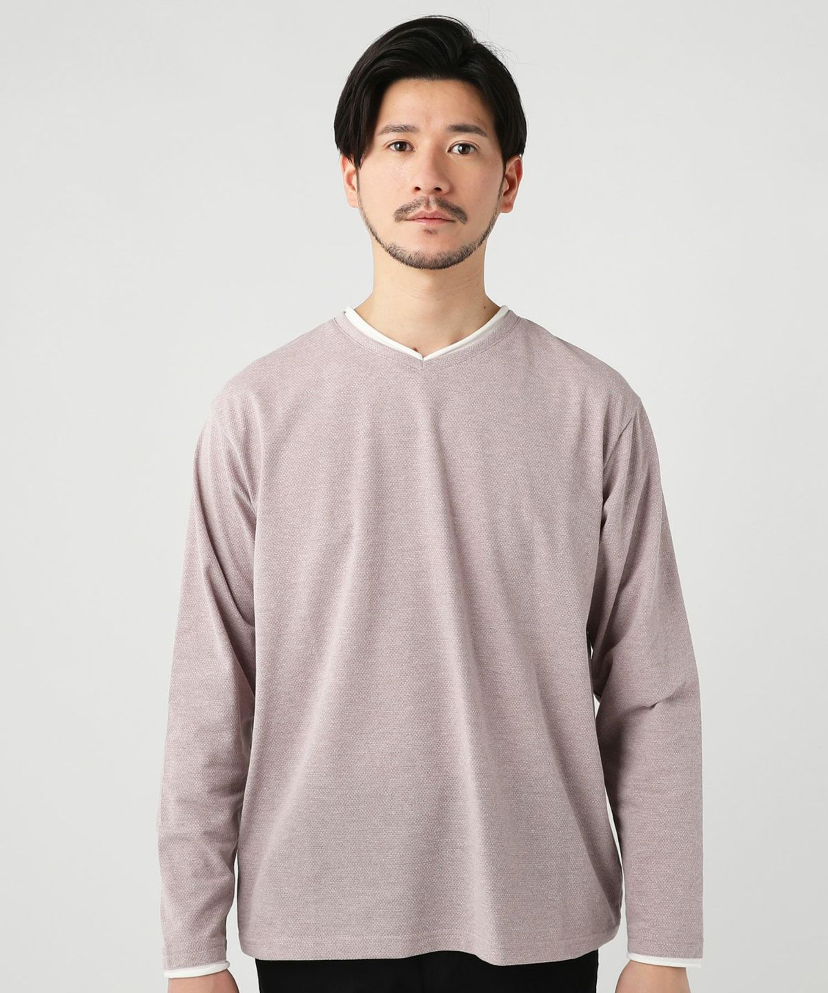 ダイヤ柄ジャガードフェイクレイヤード5分袖Vネックカットソー