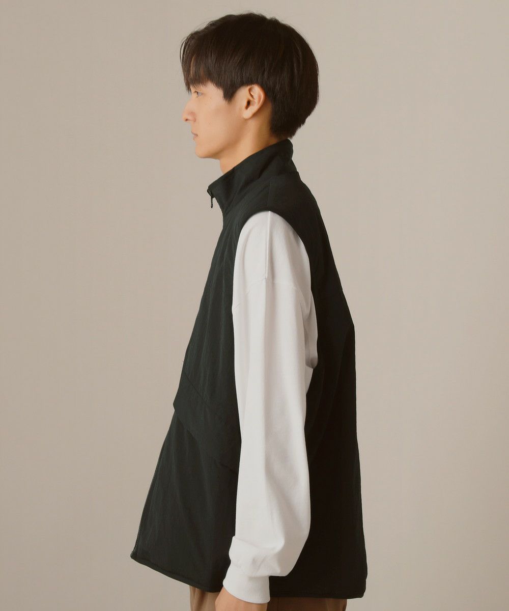 ベストと言うと着こなし方が難しいイメージもありますが、洗練されたミニマルなデザインと落ち着いた配色で仕上げたこのアイテムは、大人のカジュアルスタイルによく馴染み、高い着回し力を発揮します。アームホールと裾にはフィット感のあるパイピングを施し、クラシカルな雰囲気をプラス。トーンの異なるリバーシブル仕様は機能的で気分に応じたスタイリングを作ります。