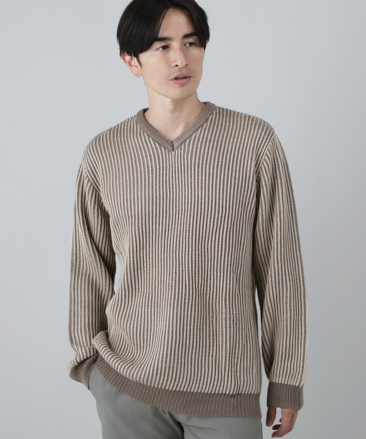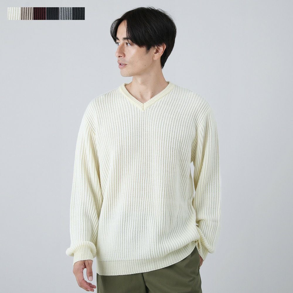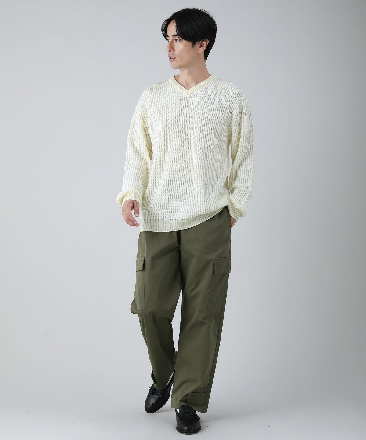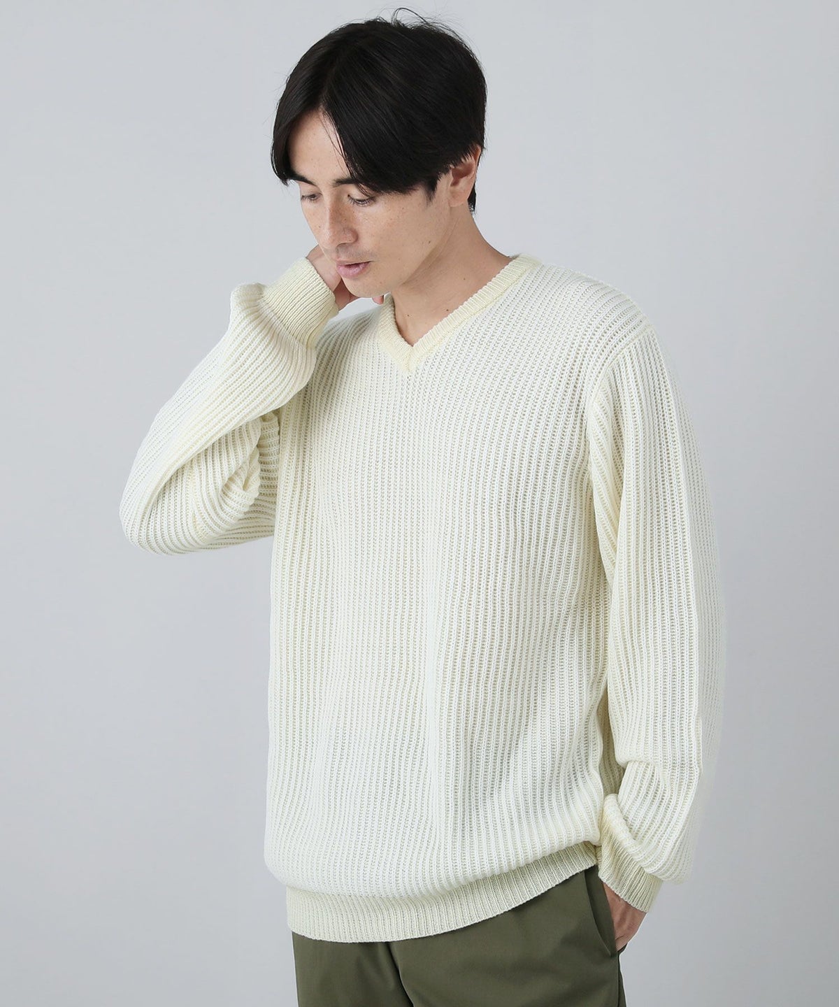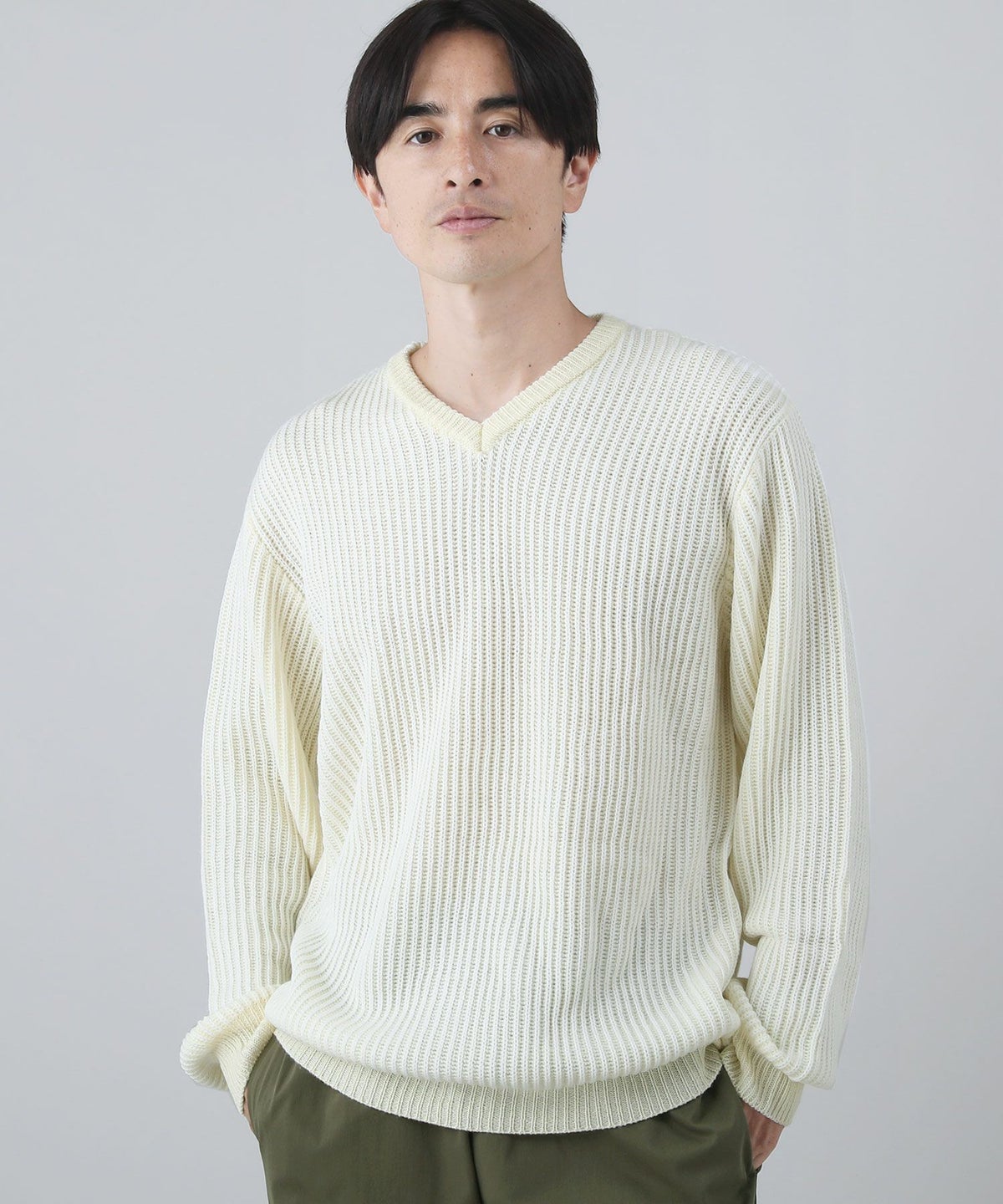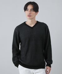 セミワイドシルエットケーブル編みVネックニット