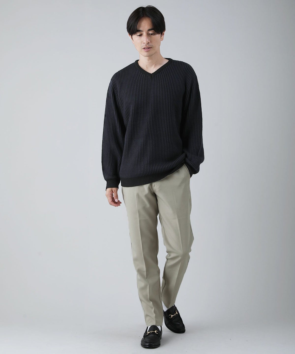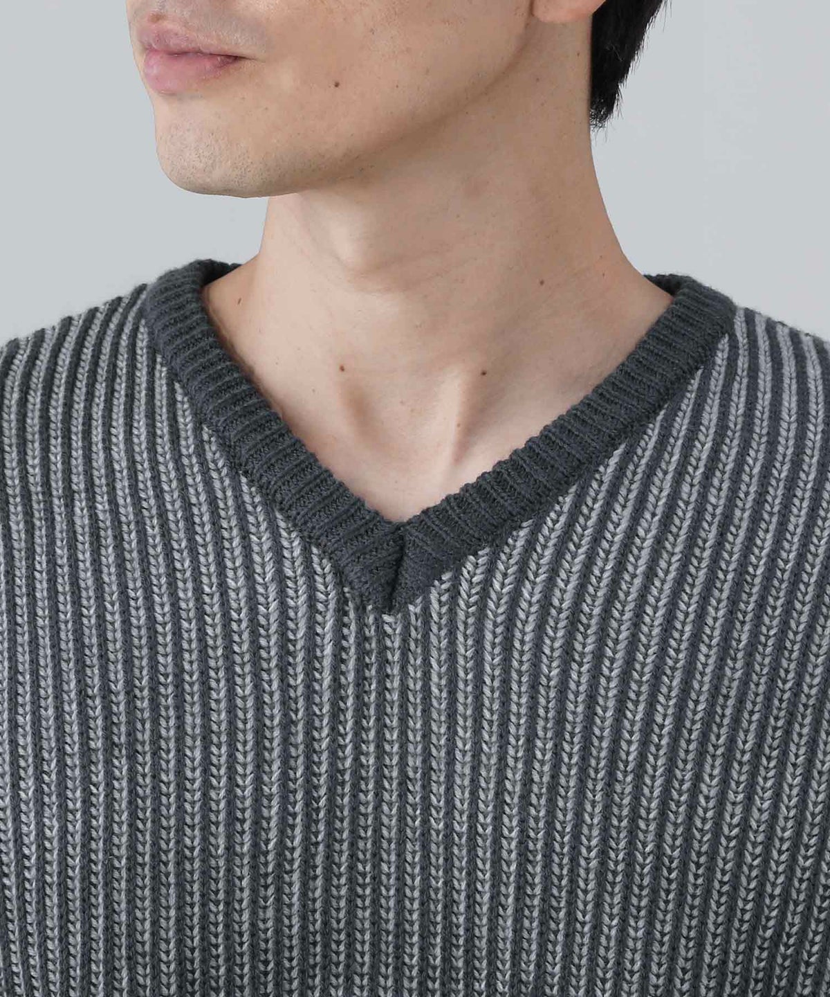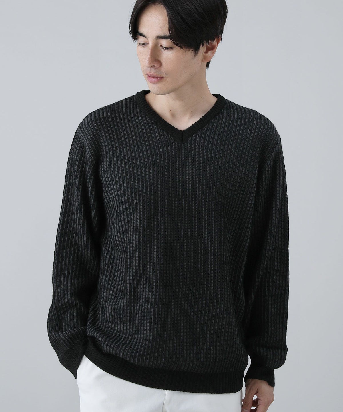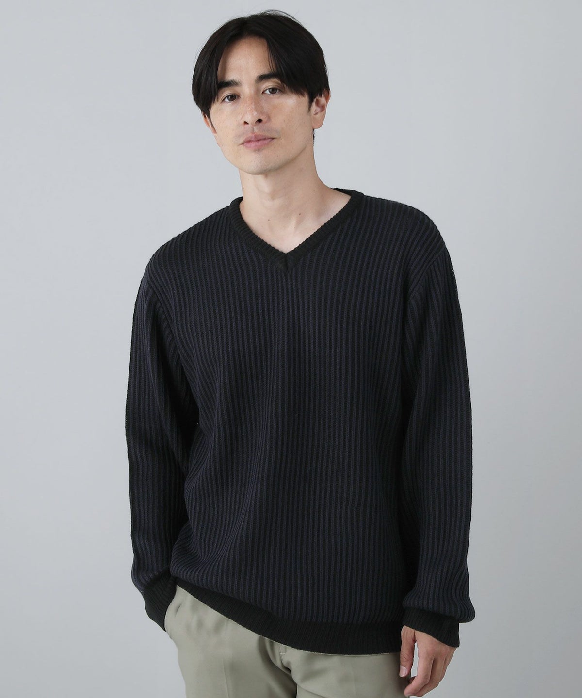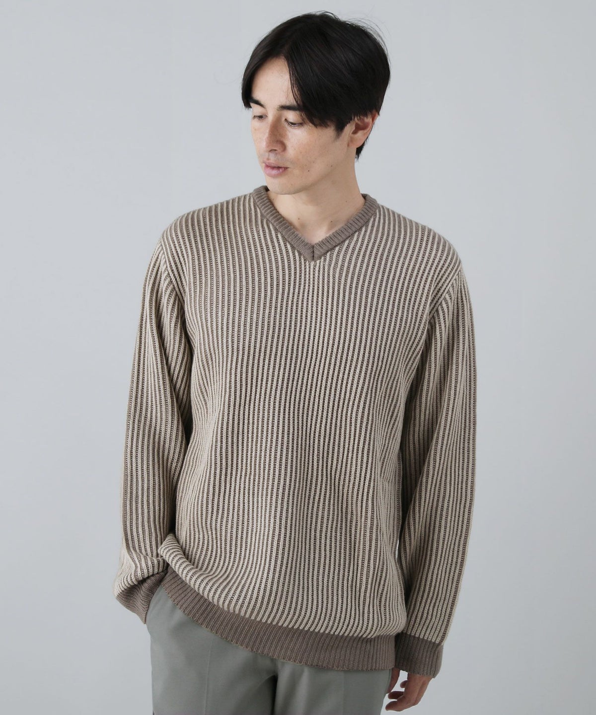 セミワイドシルエットケーブル編みVネックニット