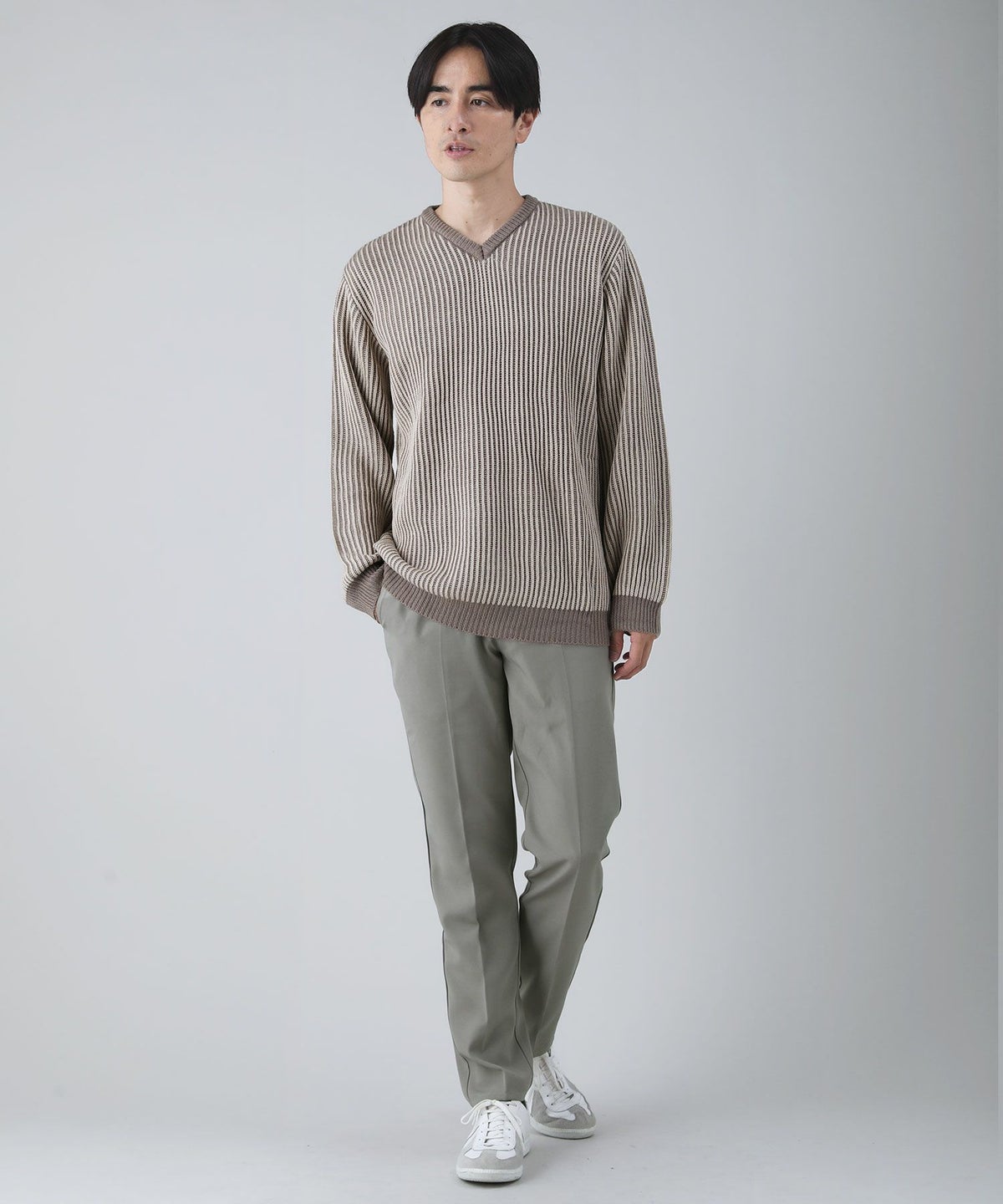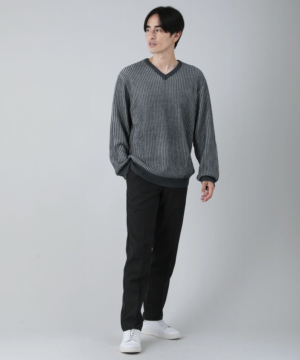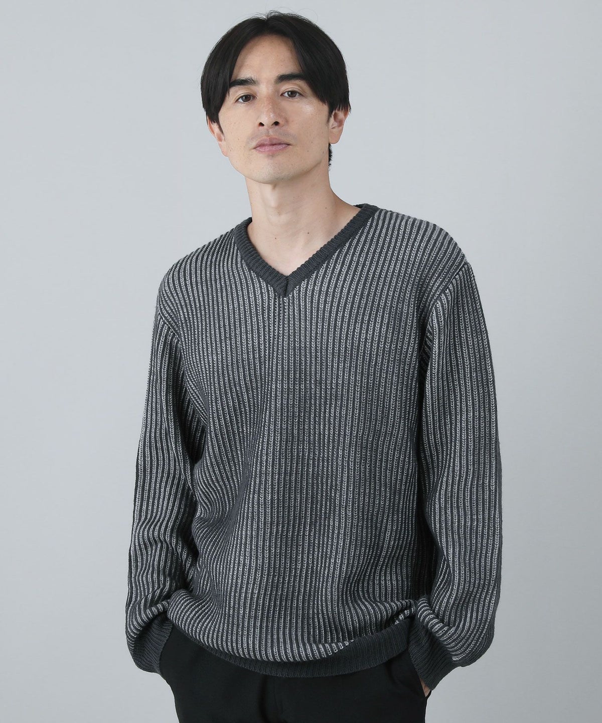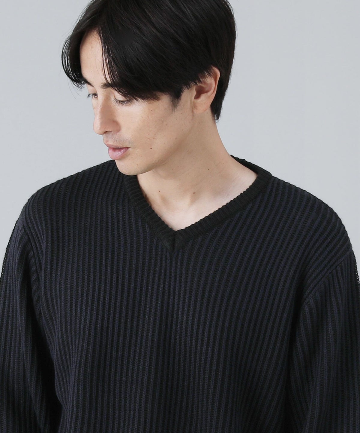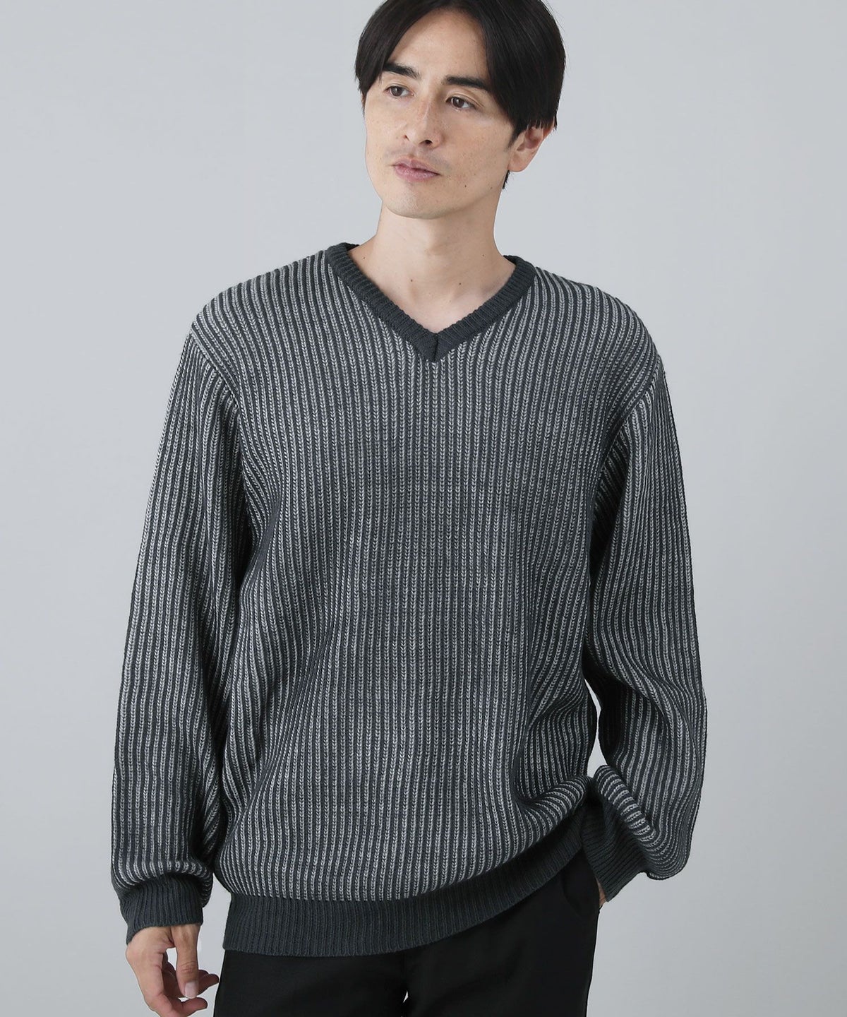 セミワイドシルエットケーブル編みVネックニット