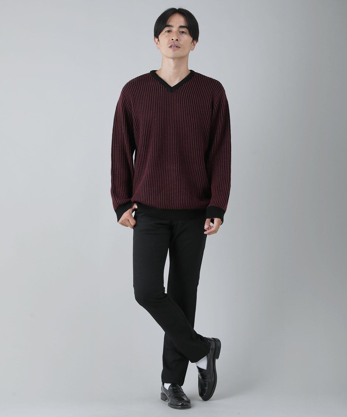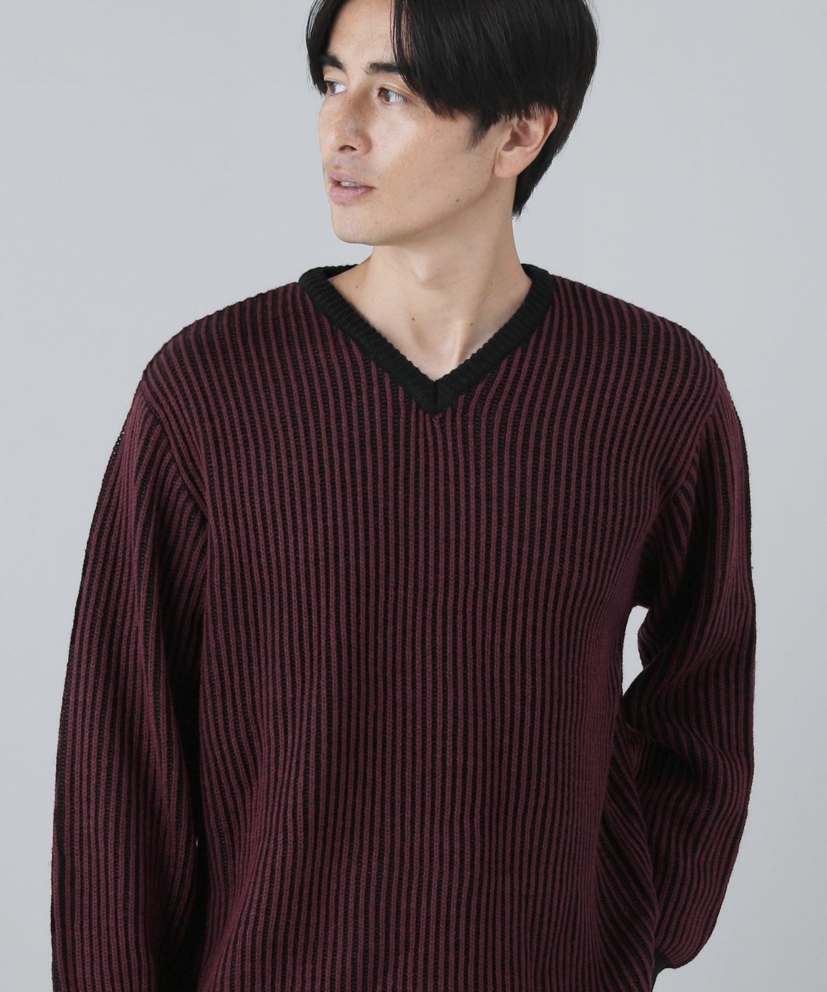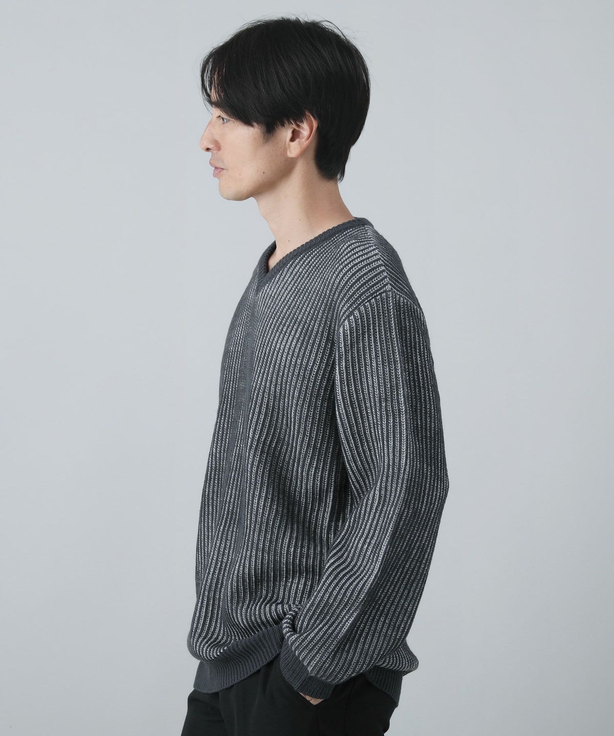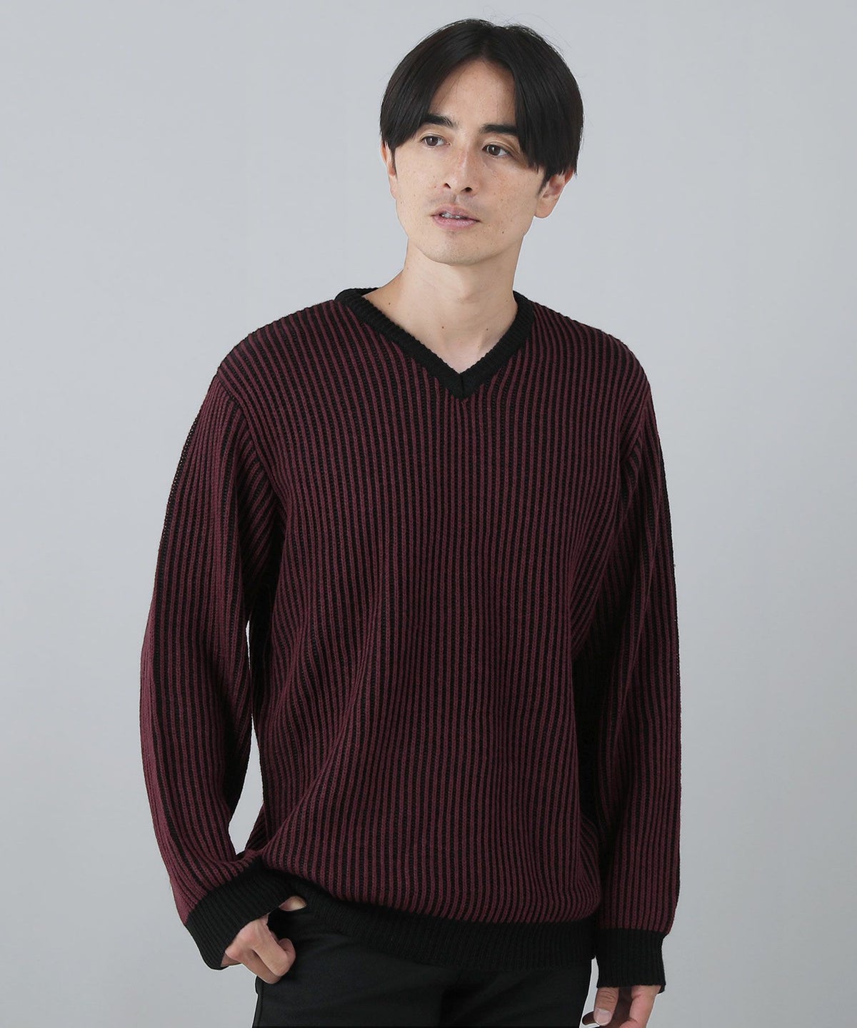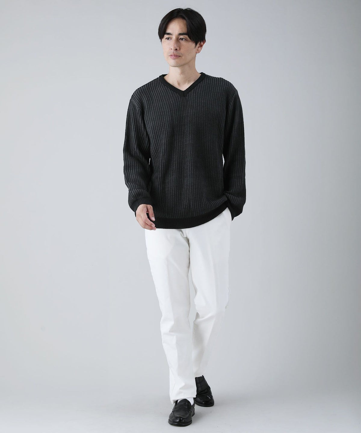 セミワイドシルエットケーブル編みVネックニット