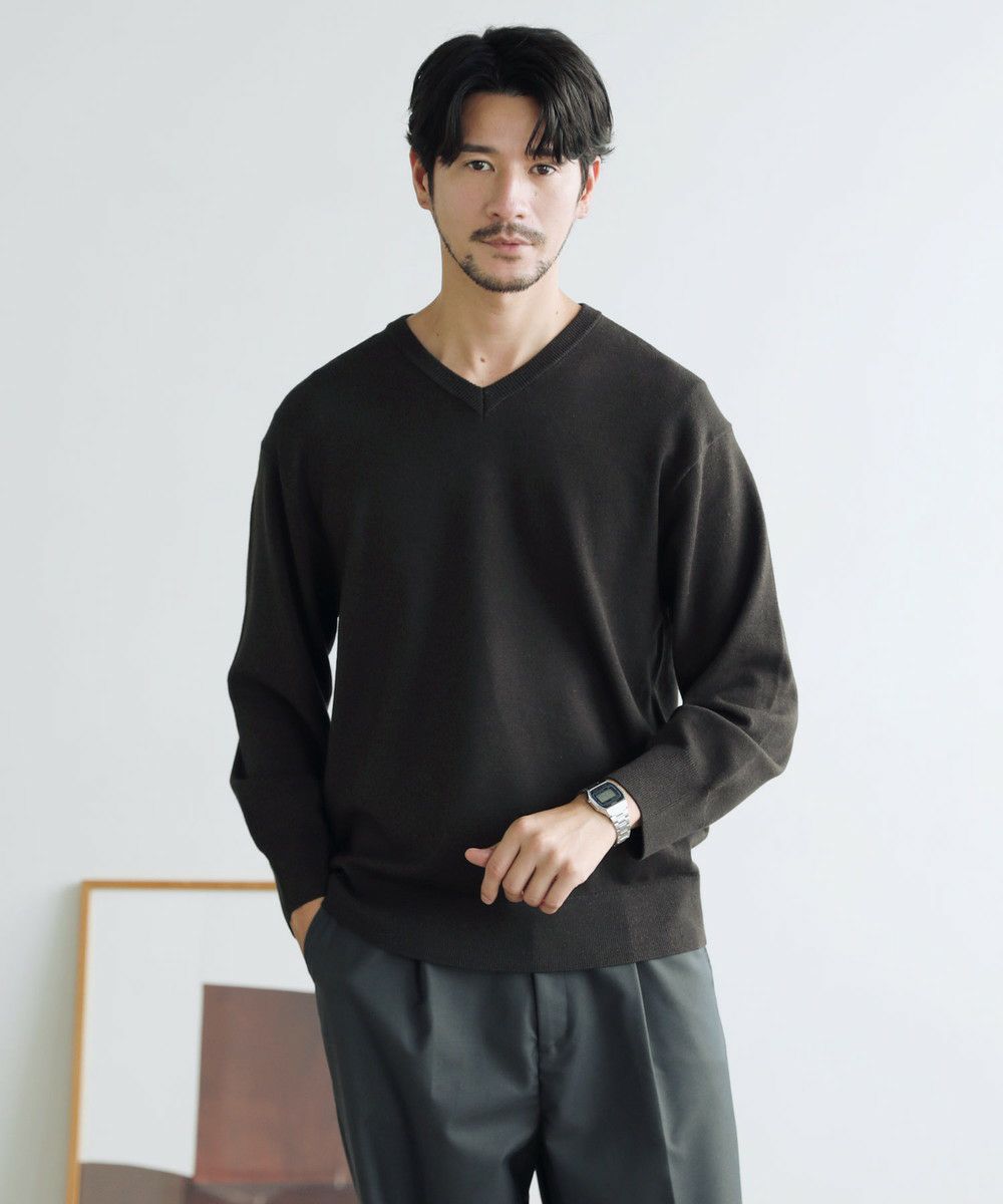 【吸湿発熱、ウォッシャブル、抗ピリング、シルク混、3シーズン着用可能】機能性シルク混コンフォートベーシック長袖Vネックニット