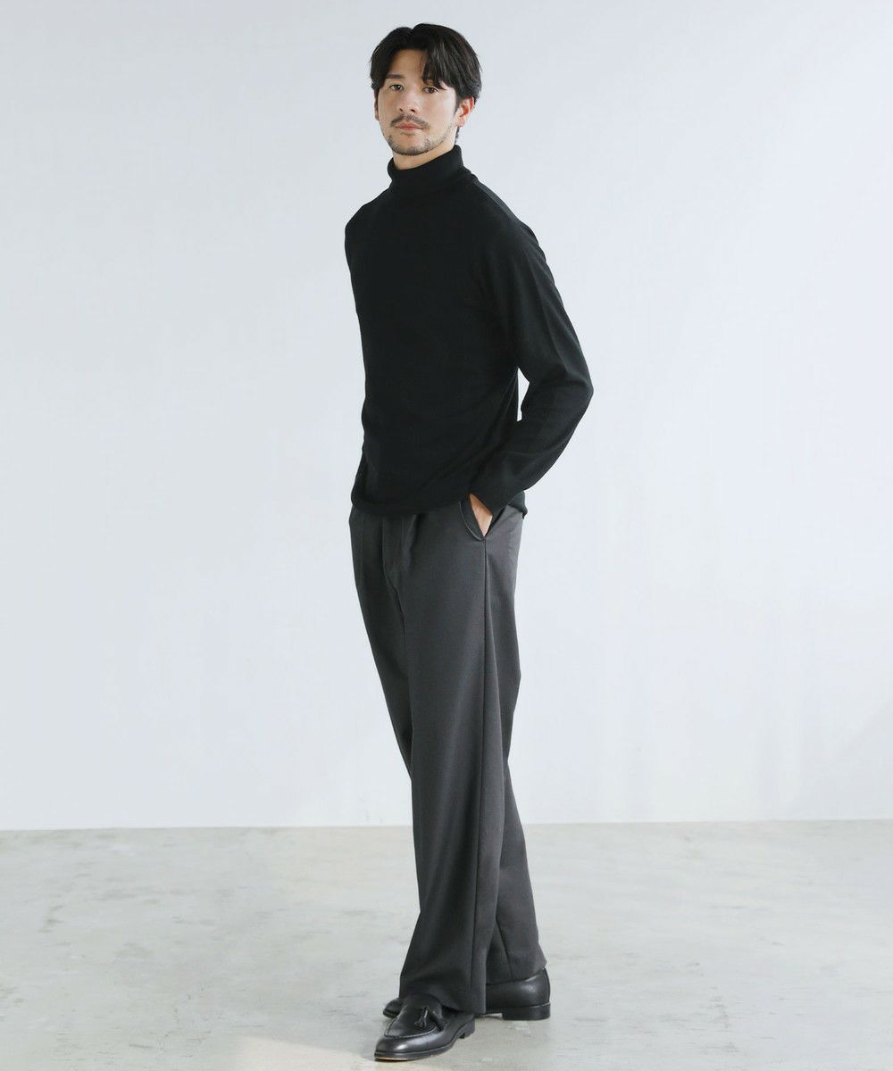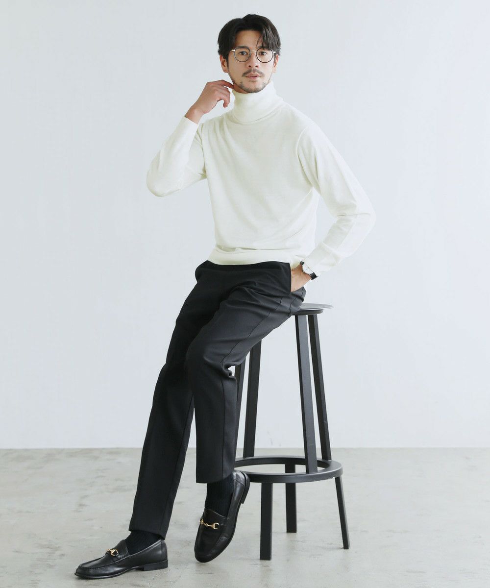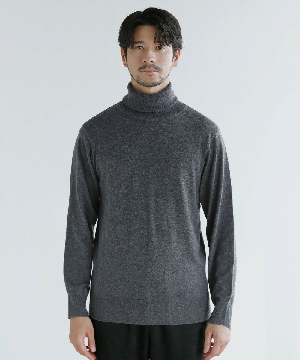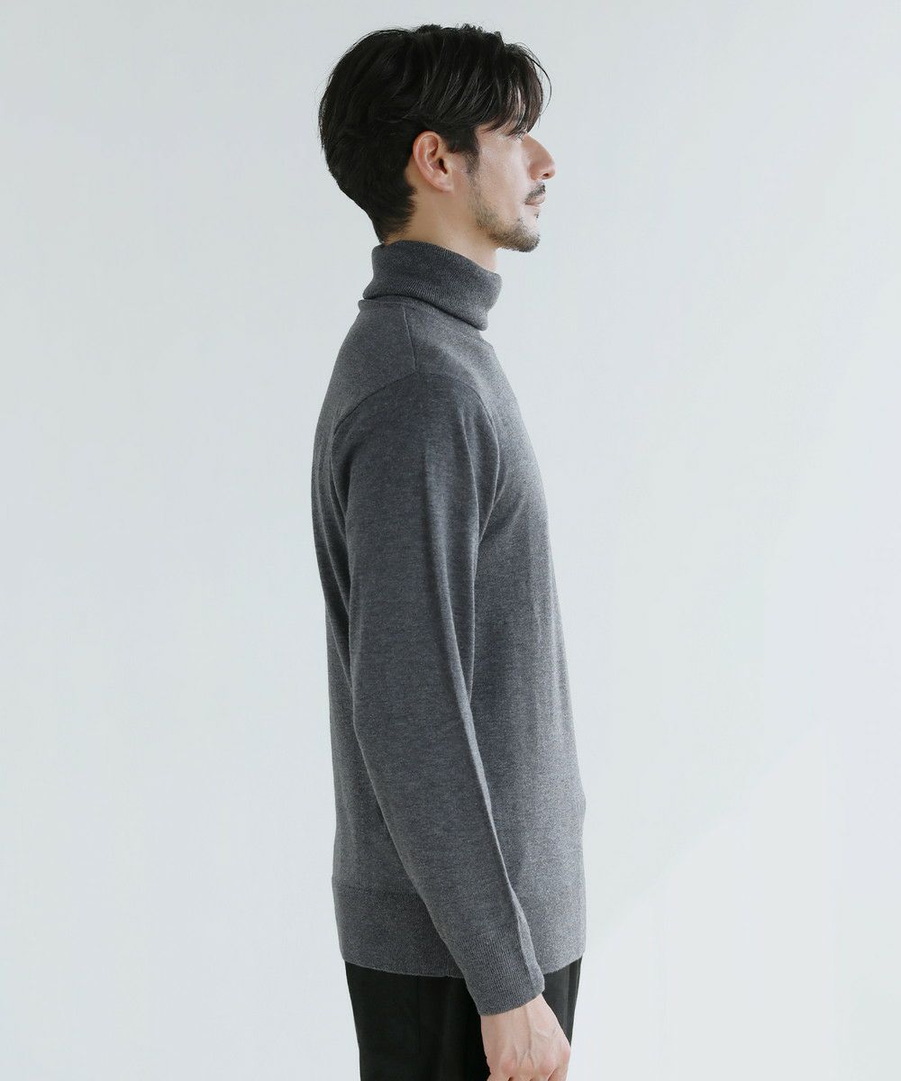 目の細かい14Gのハイゲージの編み地とすっきりとしたサイジングが魅力のタートルネックニット。