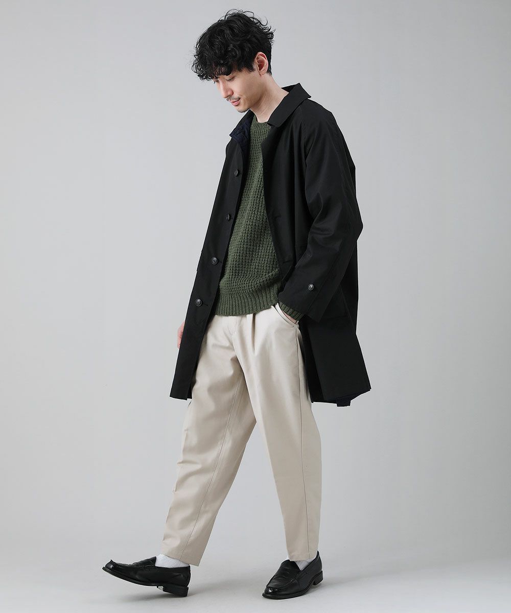 立体的で厚みが出るラーベン編みを採用しました。凸凹とした豊かな表情で存在感を放つ編地です。素材には80%ものウールを入れております。さらに、ウールだけでなく弾力性のあるナイロンを混紡することで、柔らかく動きやすい編地に仕上げました。着心地も良く、真冬でも頼れるほどの圧倒的な保温性を発揮してくれるニットとなっております。