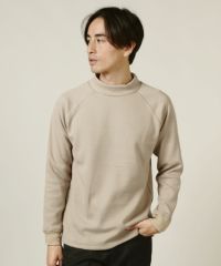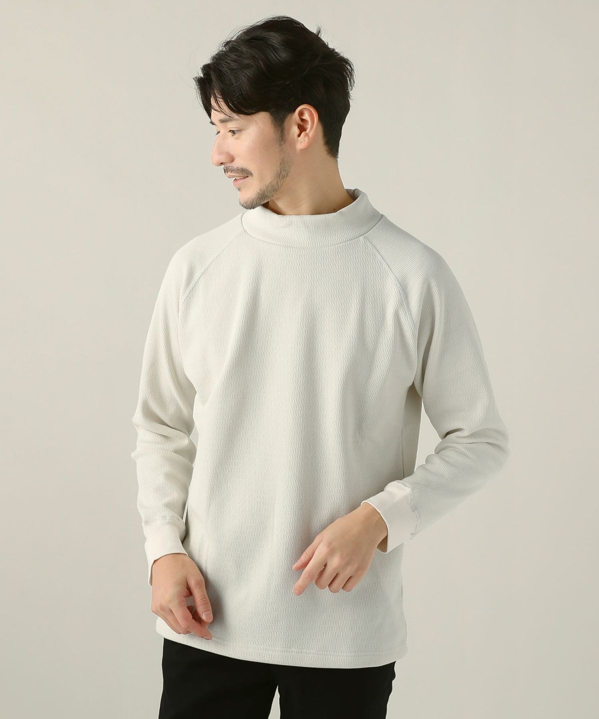 表面はハニカムサーマル組織のニット地となっております。カジュアルな印象を与えるハニカムサーマル地ですが、品の良い印象を演出するモックネックデザインと掛け合わせることにより、カジュアルにもキレイめにも合わせやすいアイテムへと仕上げました。