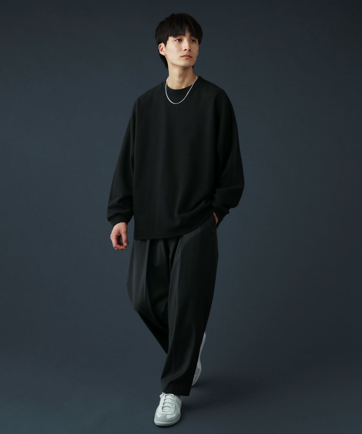 アーム部分に接ぎが無く、ゆったりとしたドルマンスリーブのシルエットが特徴的です。インナーをレイヤードしたりボトムスにタックインすることで、オーバーサイズならではの着こなしをお楽しみいただけます。