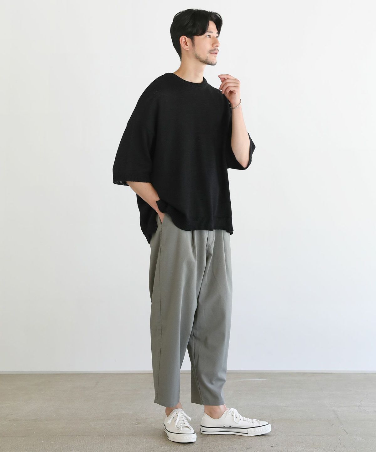 デザイン自体はシンプルなクルーネックニットですが、ざっくりとした編地がこなれ感を高めていので様々なボトムスと合わせやすいのがポイント。ワイドパンツなどの太めのボトムスと合わせれば旬のゆったりコーデが完成。また、細めのスラックスと合わせてYラインシルエットを作るのもおすすめです。