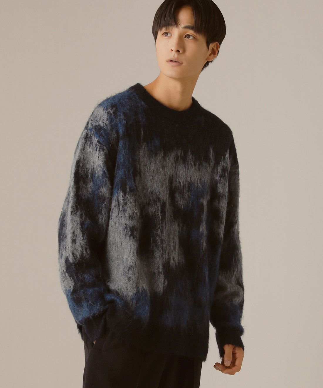 着丈と袖丈を長めに取り、全体的にゆったりとしたシルエットに仕上げました。空気を含みやすい糸は快適な着心地で軽さと温かさを兼ね備えており、上品な起毛感が全体を柔らかな雰囲気に包みます。ジーンズなどのカジュアルなアイテムとも、スラックスなどのキレイめなアイテムとも相性のいい一枚です。