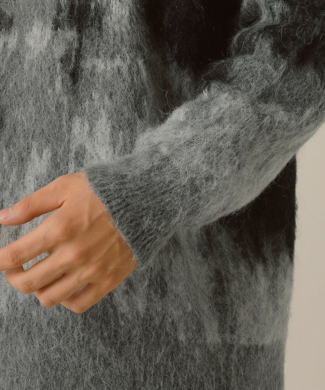 上質で柔らかなモヘアにシャギー起毛を施し、エアリーな表情に仕上げました。繊維が細く丈夫なナイロンと保温性のあるアクリルも混紡しており、軽さと暖かさの2つを両立。チクチク感がなく、柔らかく包み込むような優しい肌触りに仕上がっています。