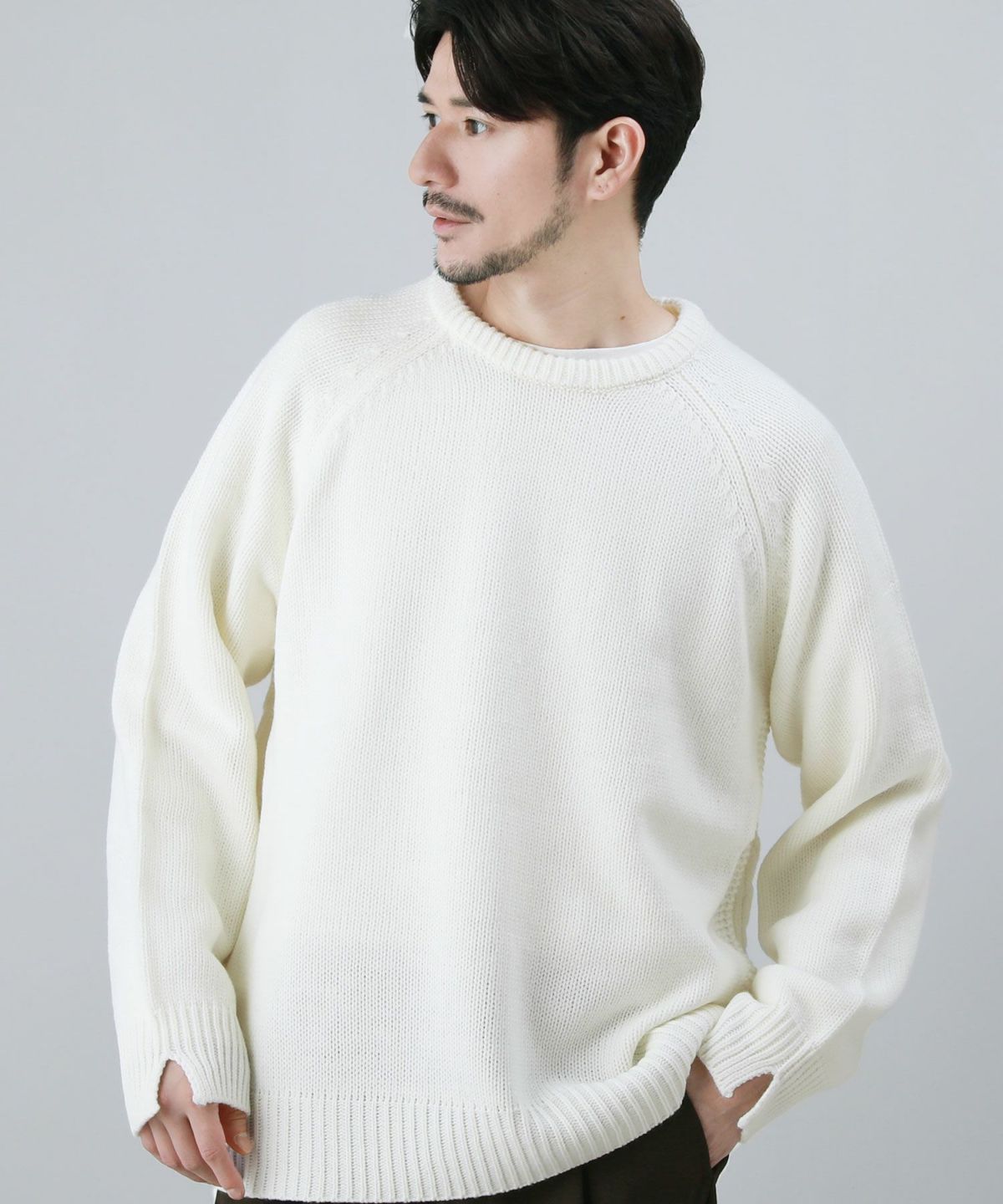 ゆとりある身幅、落ち感のあるラグランスリープの形状でリラックスした雰囲気を見せてくれます。