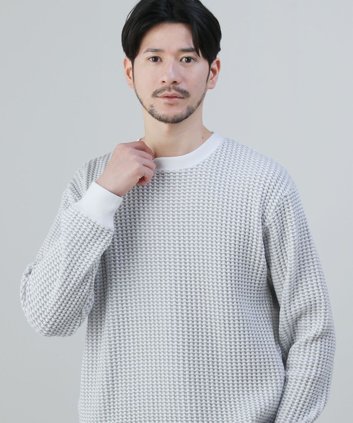 ぽこぽことした立体的な編地が特長的なワッフルニット。2色の糸で編み上げ、細かいチェック柄のような模様を作り出しました。