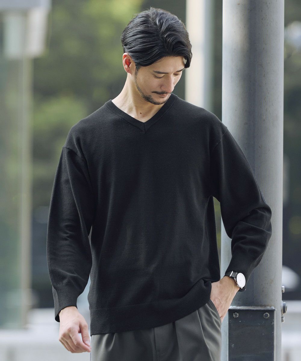 機能性シルク混コンフォートベーシック長袖Vネックニット