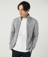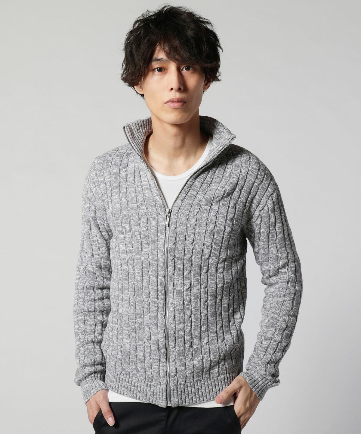 コットンケーブルニットジップアップハイネックジャケット