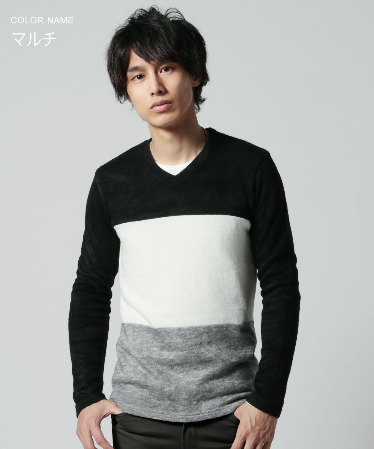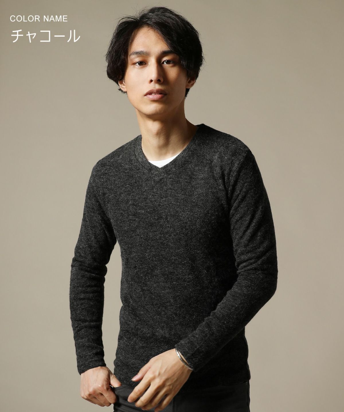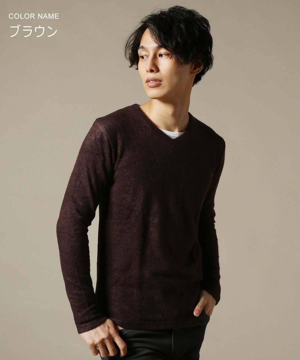 セミワイドシルエットケーブル編みVネックニット
