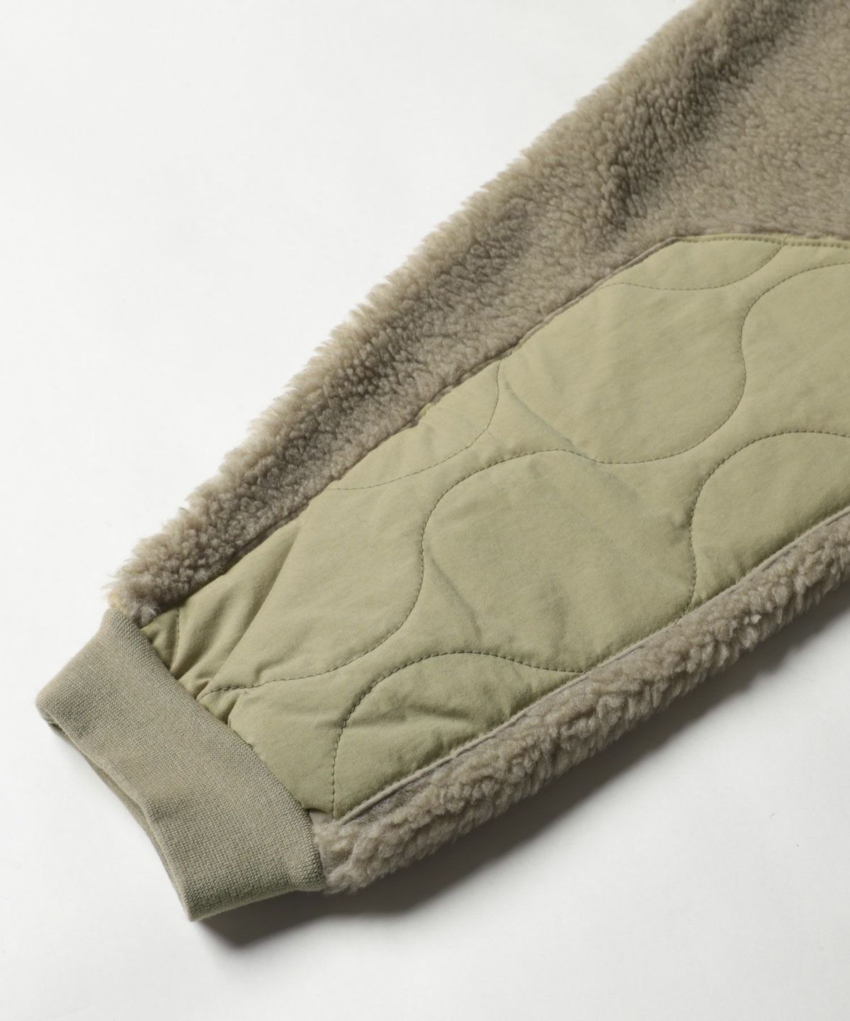 ボアがボリューム感たっぷりの丸いフォルムを作り、胸元のウェーブキルトが、アウトドアのエッセンスを加えてくれます。袖下にもナイロン素材を使用したウェーブキルトのあて布を使用。袖下の汚れやすい部分を水や汚れなどからガードしてくれます。
