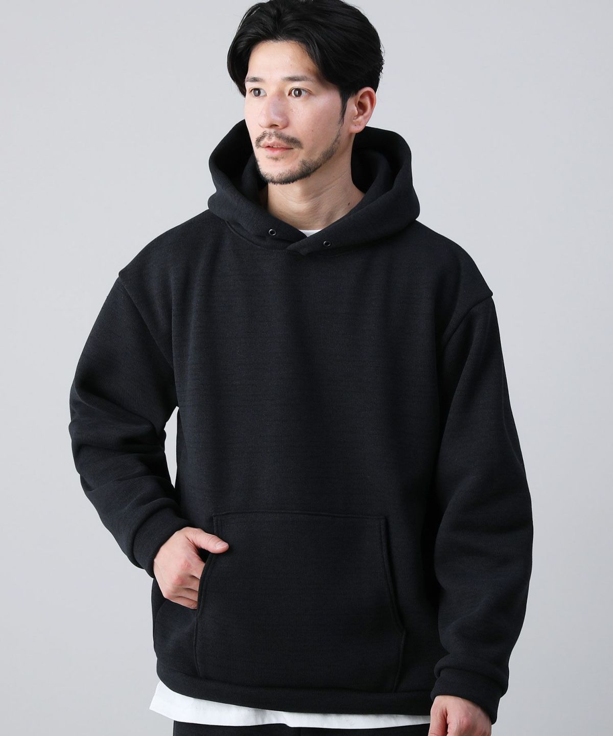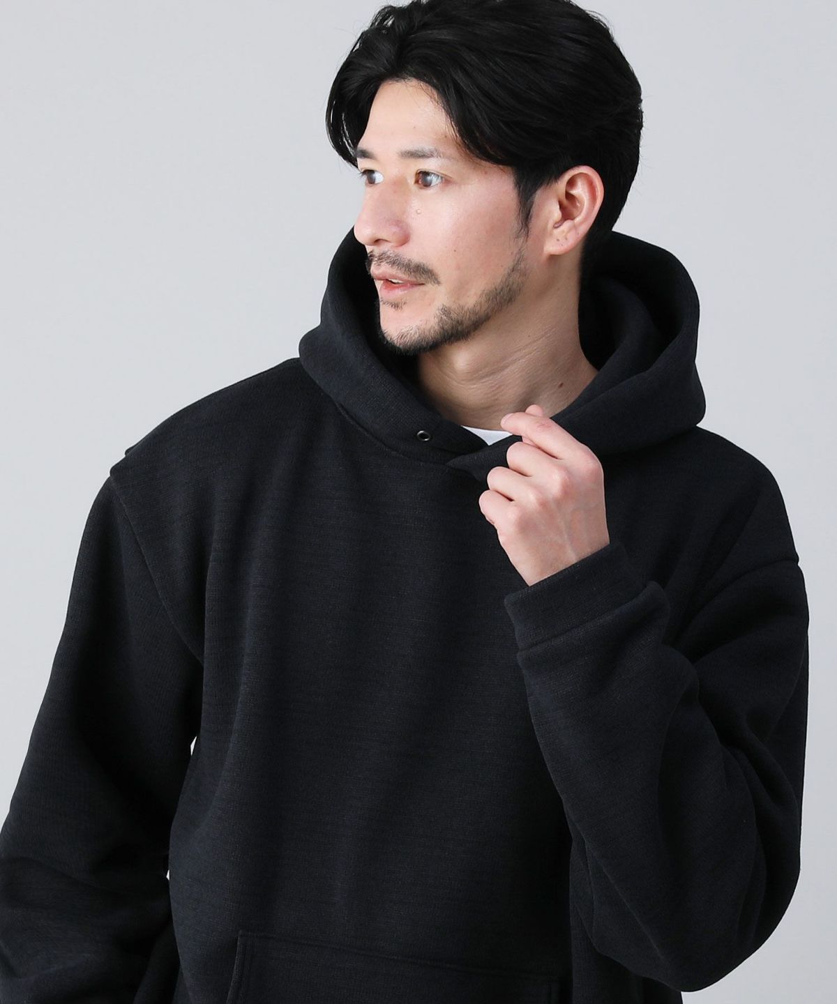 表面の上品なメランジ感が際立つセーターのような見た目で、落ち着いたシンプルな色合いが魅力的。紐なしパーカーなのでスッキリと見栄えが良く、サイズはリラックス感のあるドロップショルダーでストレスフリーな着心地です。また、腹部に設けられたカンガルーポケットはデザイン性だけでなく手を温めるのにも便利です。