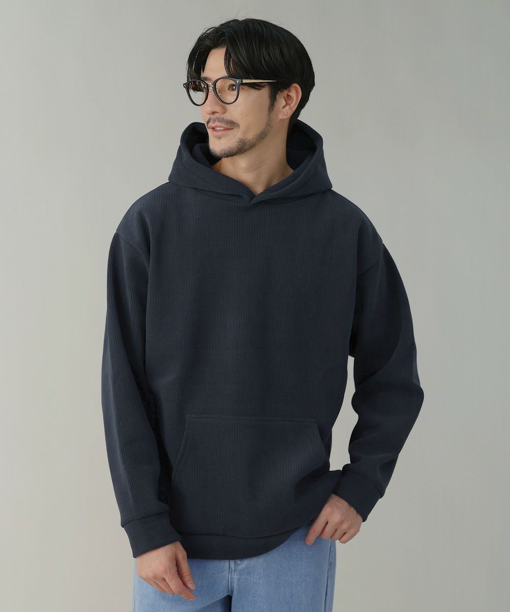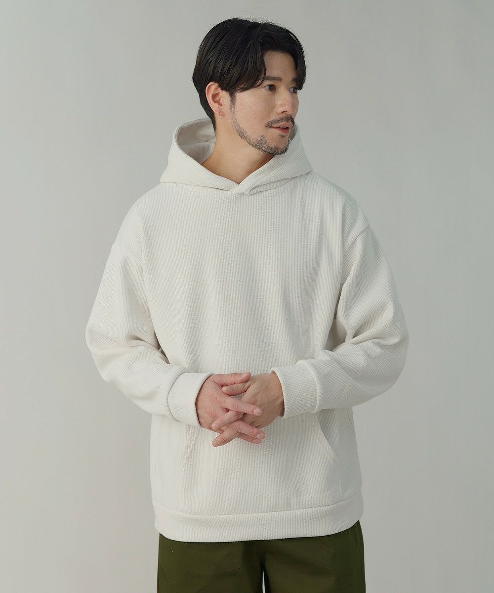 身幅や腕まわりを広めに取った窮屈感のないゆったりシルエット。肩を落としたドロップショルダーも、リラックス感を生むのに一役買っています。フロントにはカンガルーポケットが付いており、スマホなどの小物を収納することが可能。フード部分は立ち上がりをキープしてキレイなシルエットを生み出すため、生地を二重にして厚みを出しました。