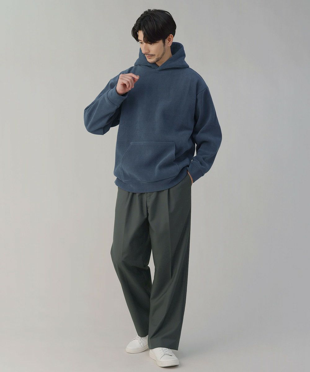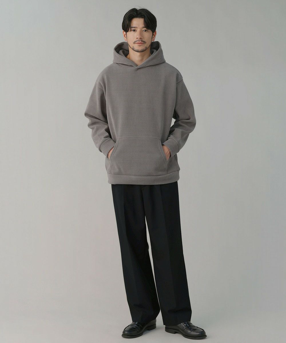 スッキリと見栄えが良い紐なしパーカーは、キレイめなスラックスからカジュアルなデニムまで幅広いテイストと相性抜群。シンプルなデザインで着回し力が高く、肌寒い季節に重宝する一着です。
