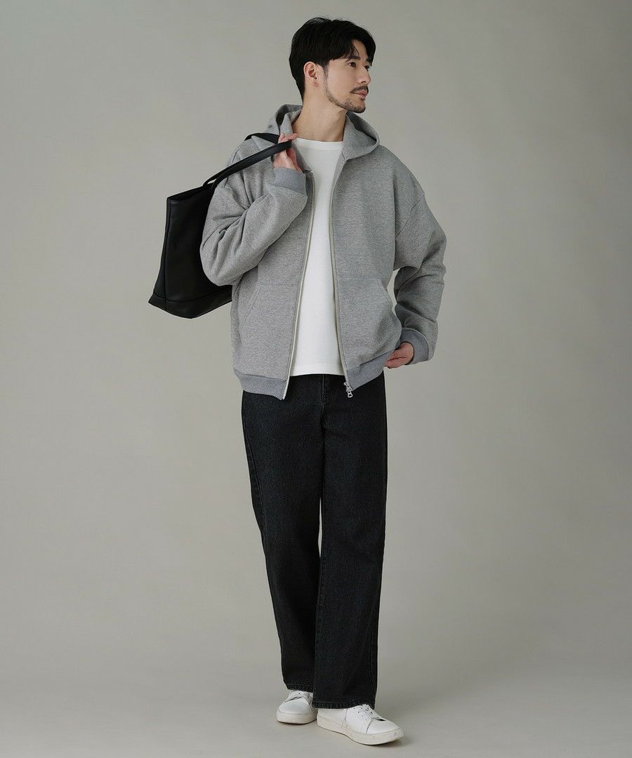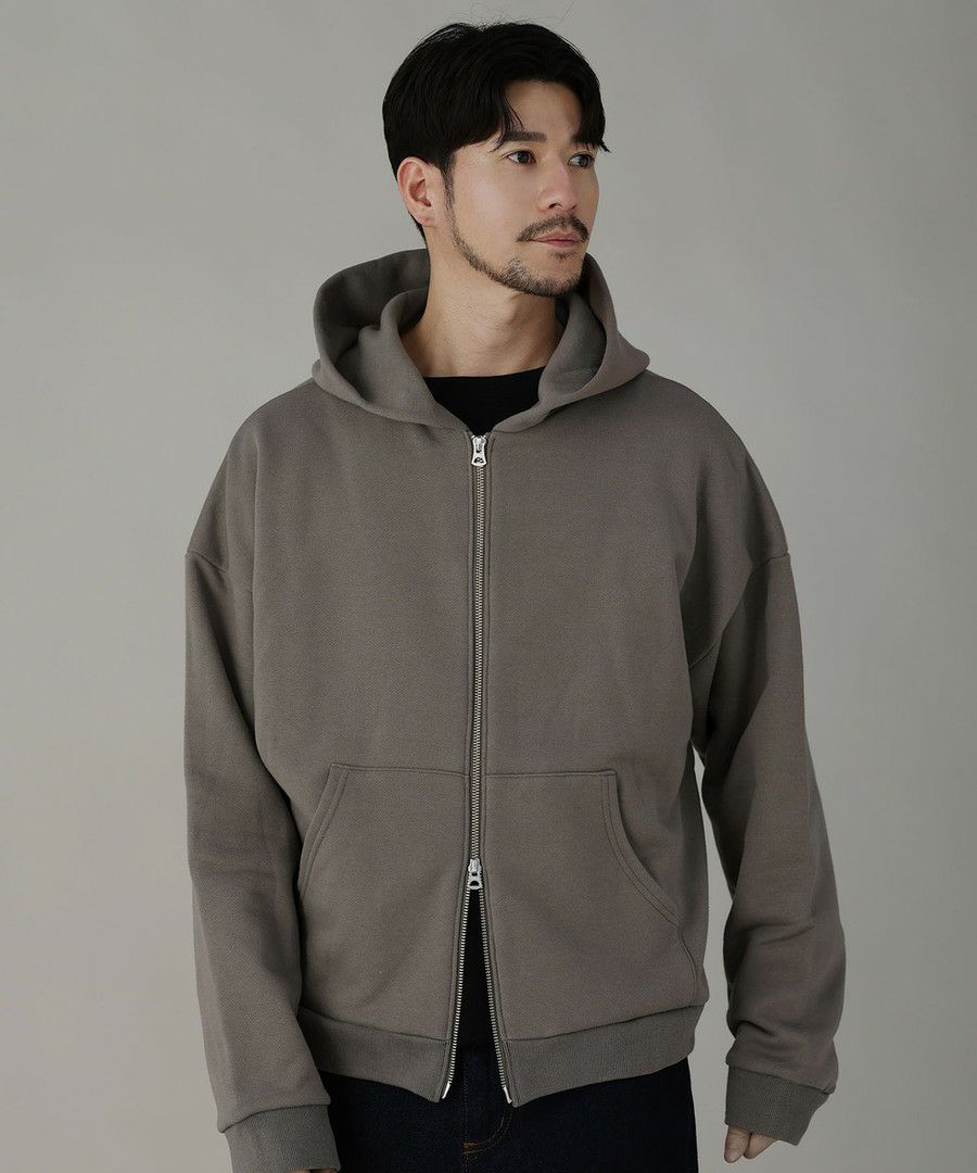 ワイドな身幅と短めの着丈が絶妙なバランスを生み、シンプルながらも今っぽい抜け感を演出。ダブルジップ仕様で、開け方次第でシルエットを変化させたりインナーをレイヤードさせたりと、着こなしを自由に楽しめます。フード部分は生地を二重にして厚みを出すことで、立ち上がりがキープされるように設計。さらに、ゆとりのあるアームホールとドロップショルダーで、リラックス感溢れる一着に仕上げました。