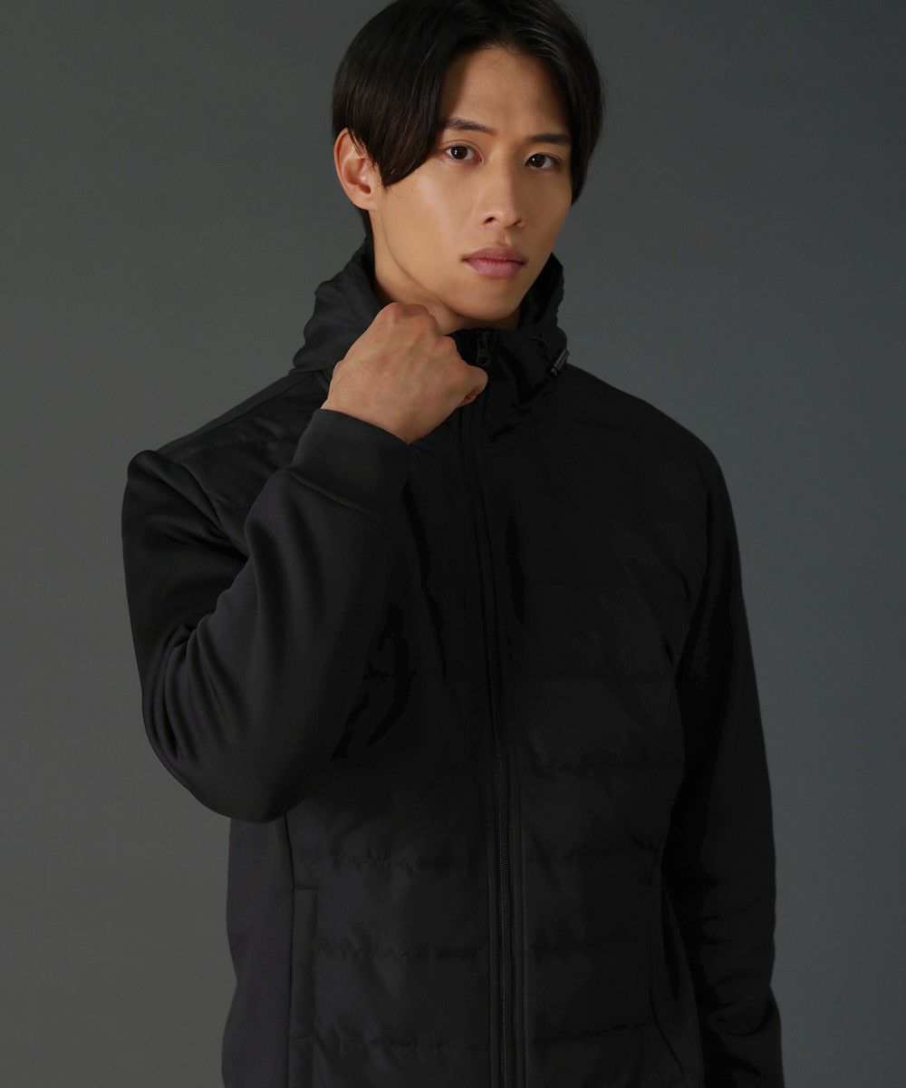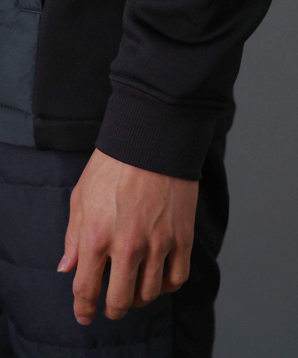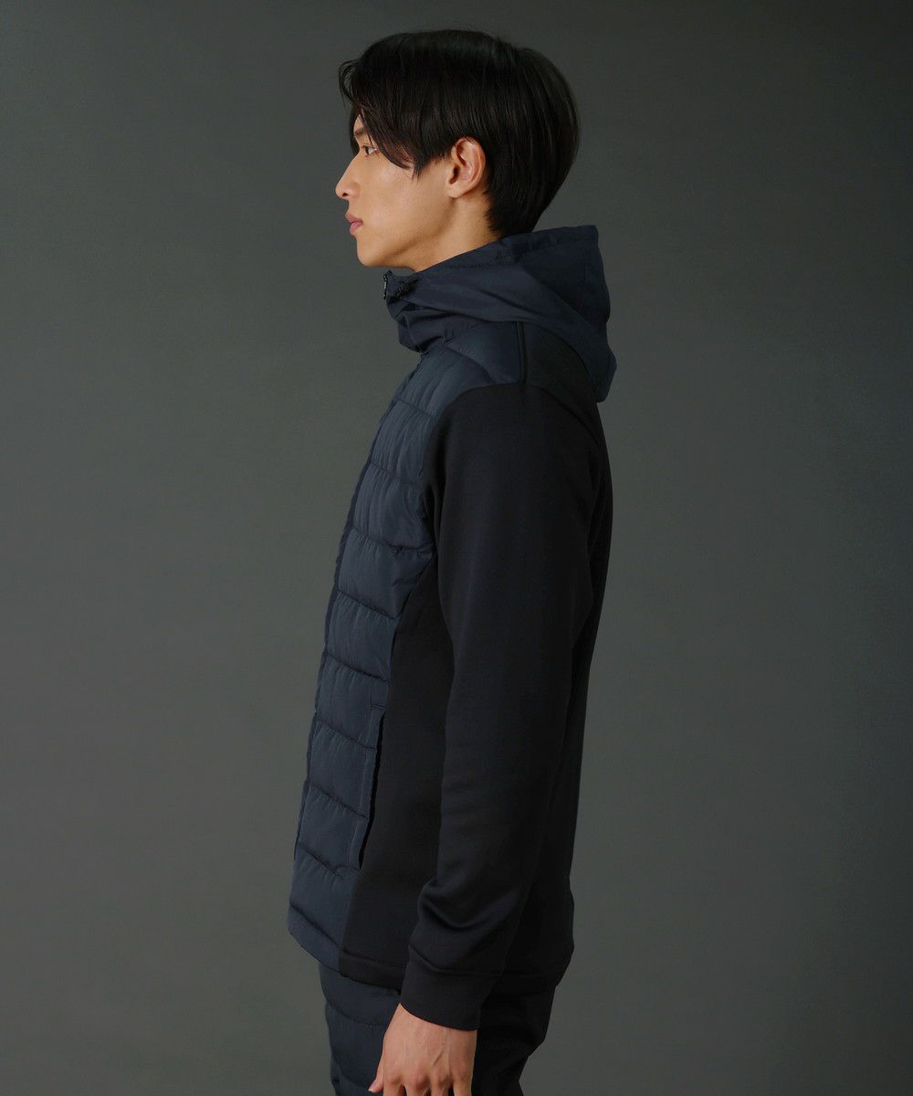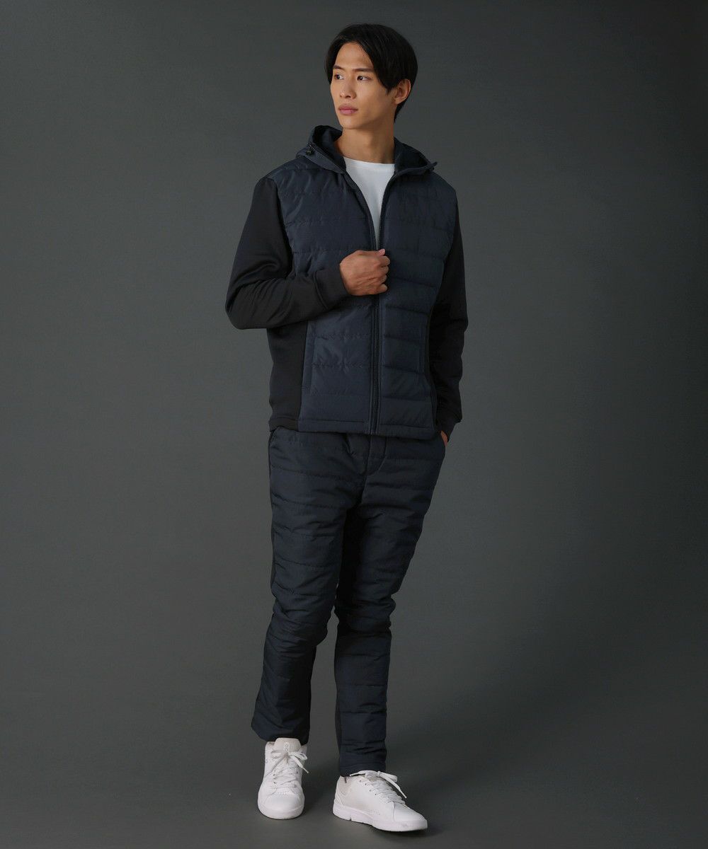 サイドに切り替えデザインを入れ、前身頃だけにダウンフェザーを入れることですっきりとした細身のシルエットを完成させています。袖と後ろ身頃にはストレッチ性の高いジャージー生地を採用。背中・肩・肘と抜群の伸縮性を発揮するのでゴルフでの着用にもおすすめです。上からさらにアウターを重ねれば、インナーダウンとしても活躍します。前身頃以外はフィット感の高いスマートなつくりで、アウターを羽織るときのごわつきも抑えられる設計に。アウターとしてもインナーとしても重宝する、着回しやすいデザインです。