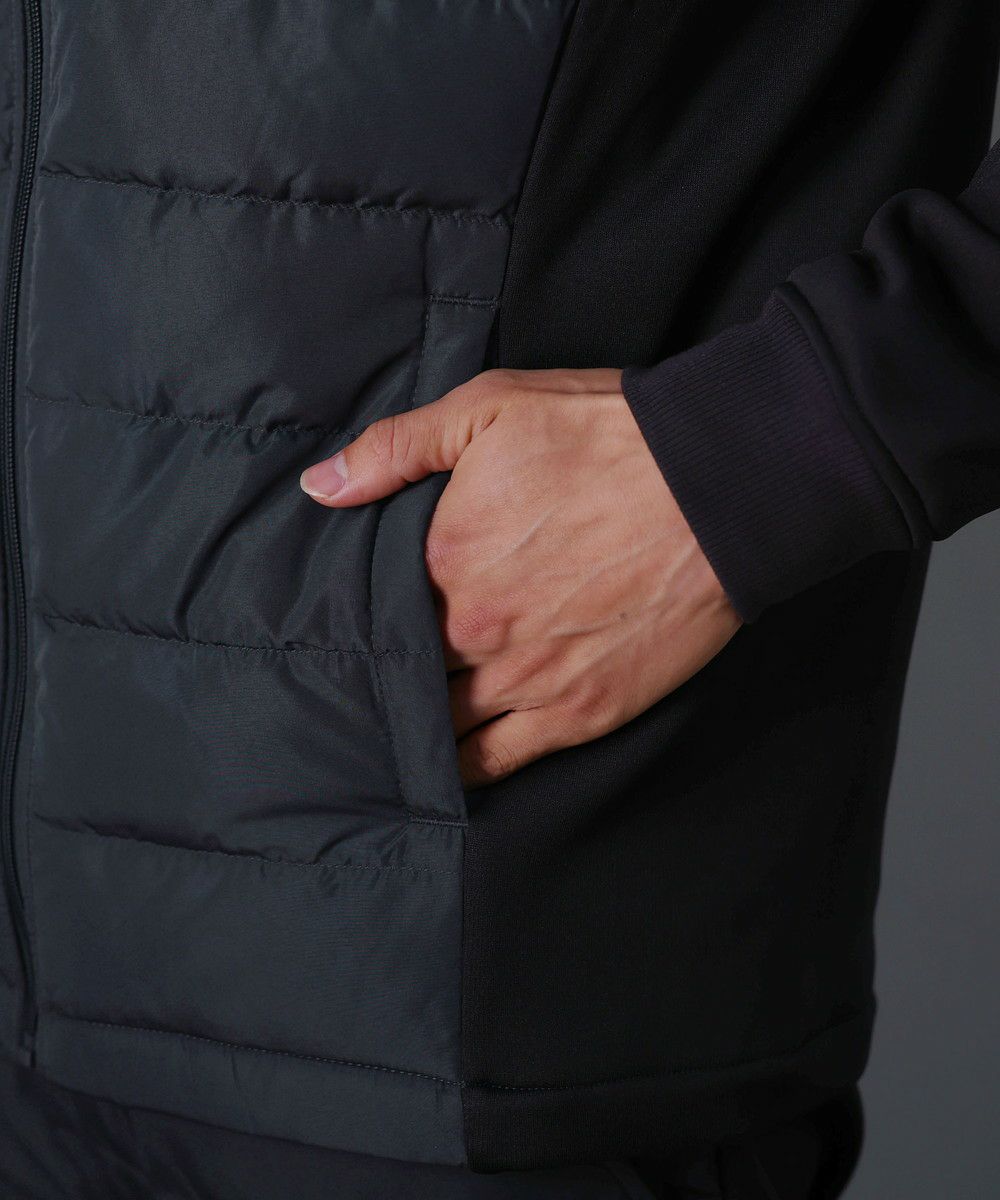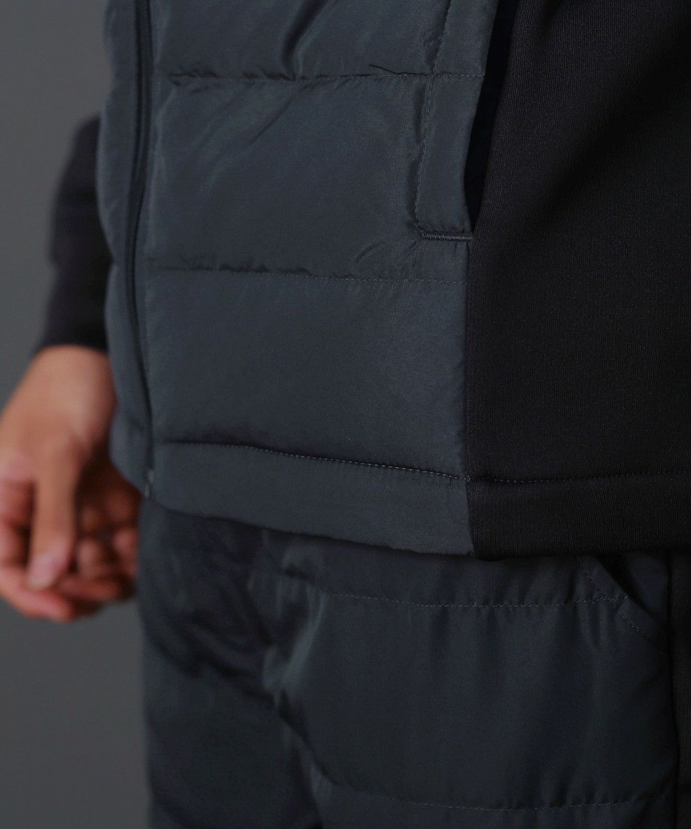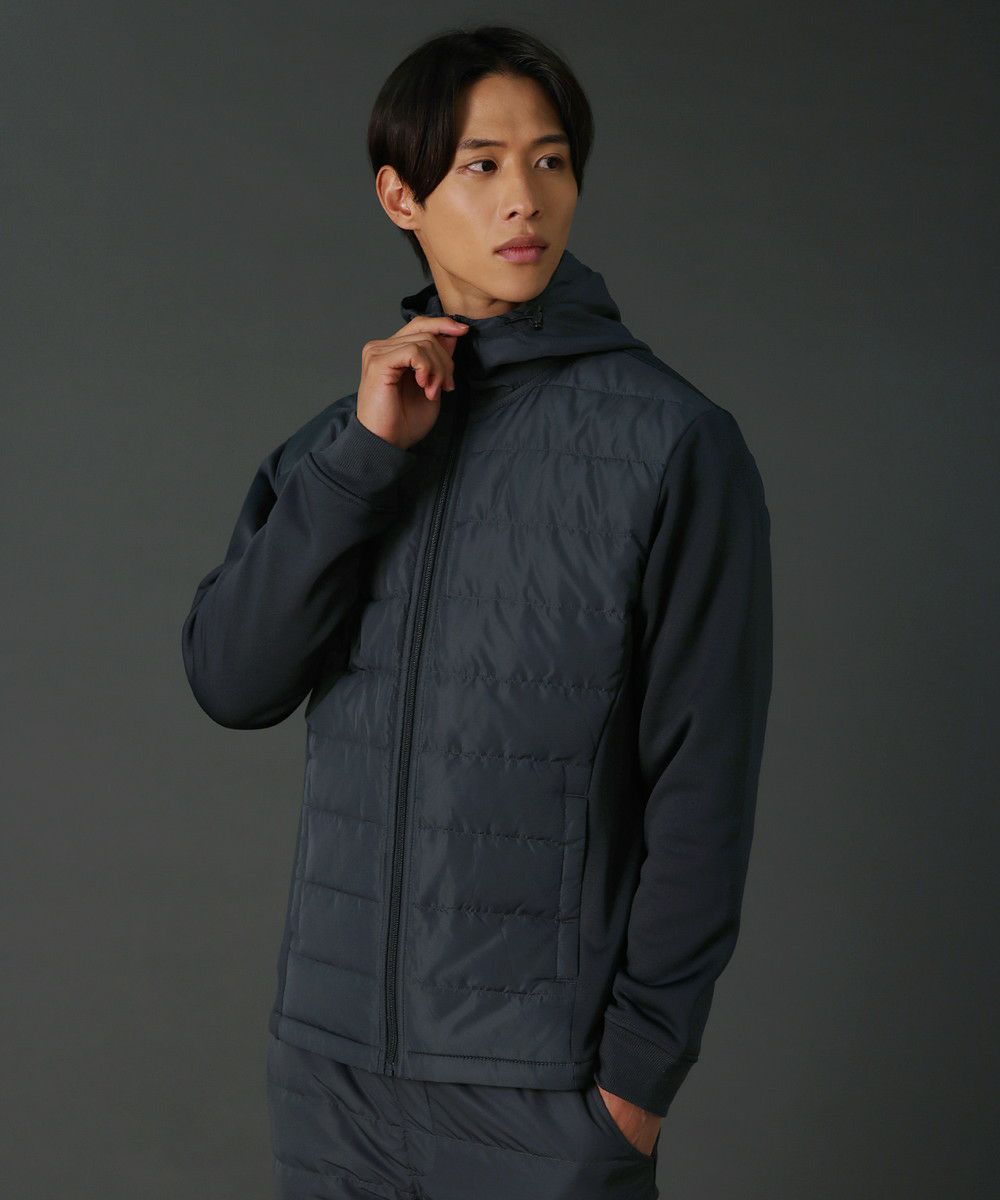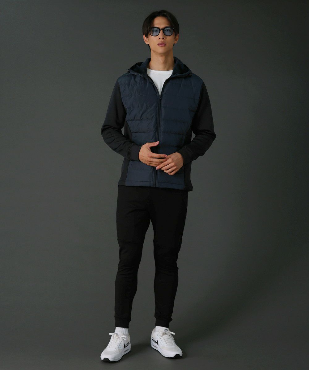 サイドに切り替えデザインを入れ、前身頃だけにダウンフェザーを入れることですっきりとした細身のシルエットを完成させています。袖と後ろ身頃にはストレッチ性の高いジャージー生地を採用。背中・肩・肘と抜群の伸縮性を発揮するのでゴルフでの着用にもおすすめです。上からさらにアウターを重ねれば、インナーダウンとしても活躍します。前身頃以外はフィット感の高いスマートなつくりで、アウターを羽織るときのごわつきも抑えられる設計に。アウターとしてもインナーとしても重宝する、着回しやすいデザインです。