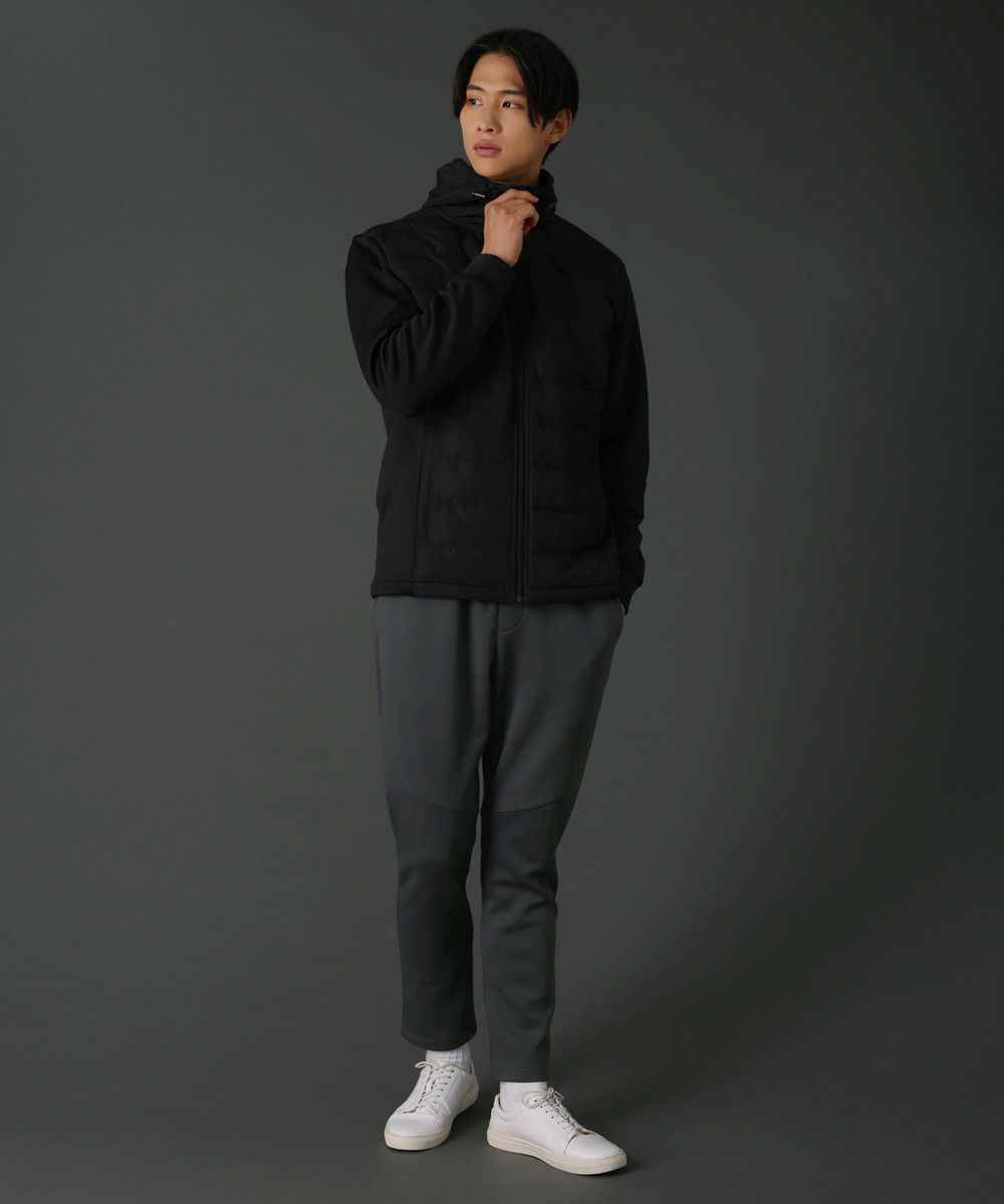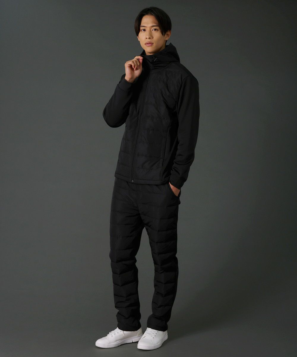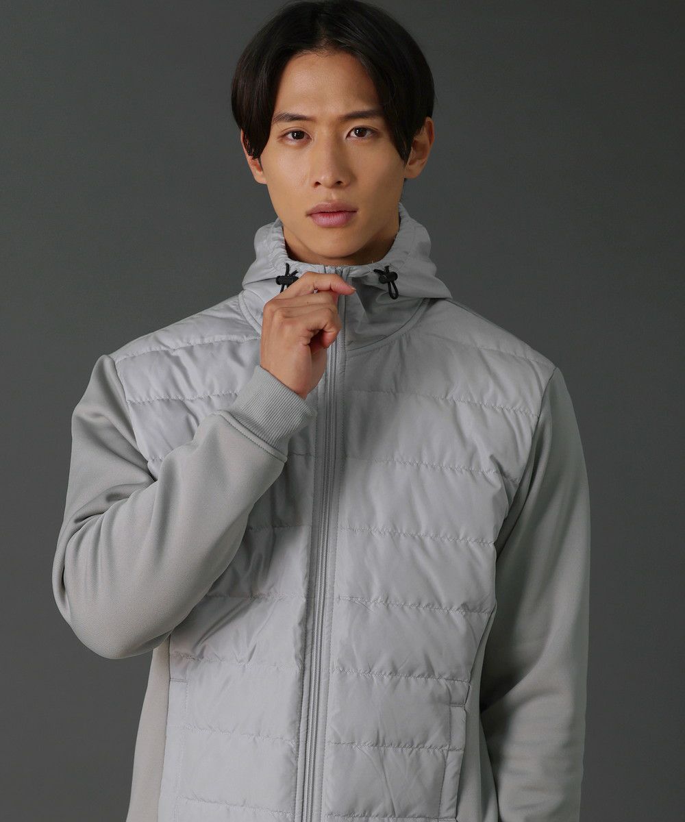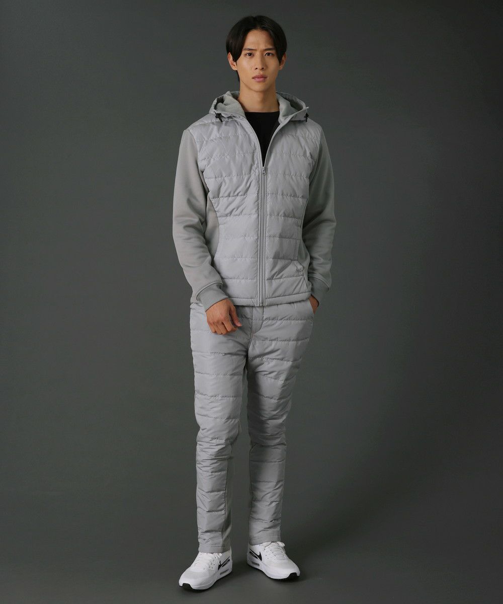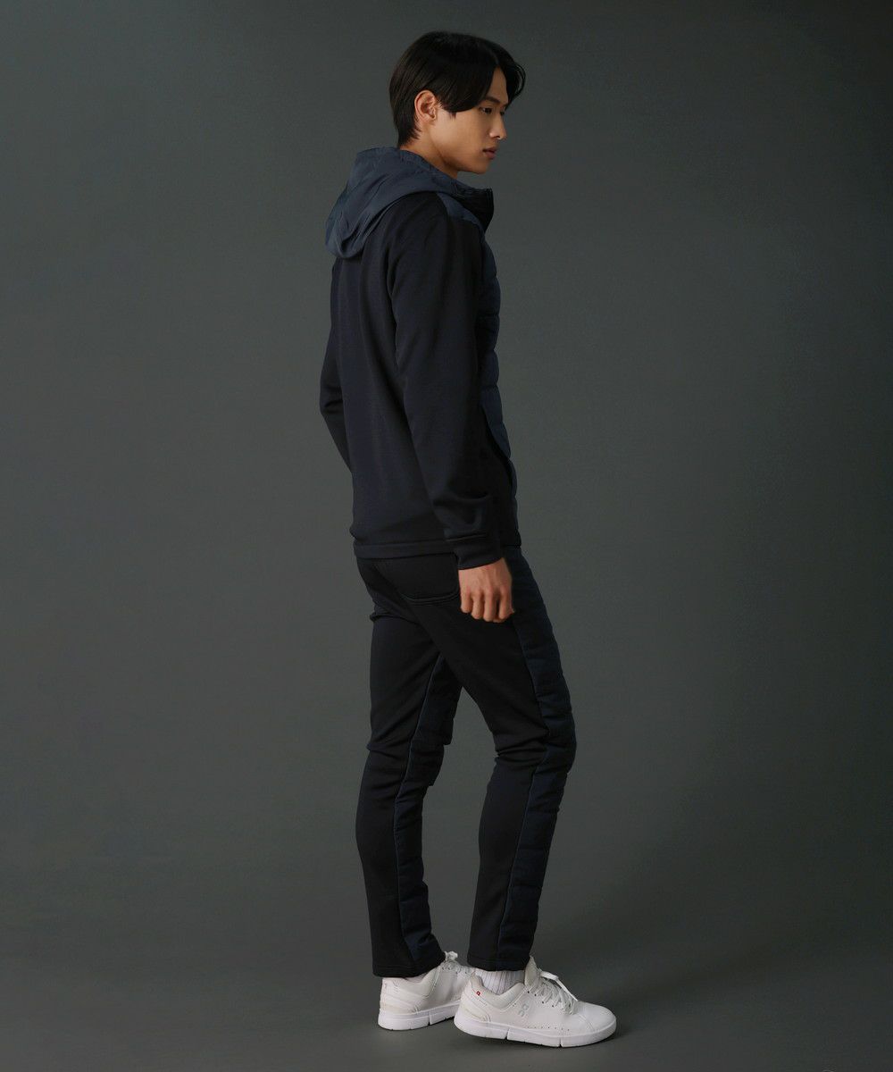 サイドに切り替えデザインを入れ、前身頃だけにダウンフェザーを入れることですっきりとした細身のシルエットを完成させています。袖と後ろ身頃にはストレッチ性の高いジャージー生地を採用。背中・肩・肘と抜群の伸縮性を発揮するのでゴルフでの着用にもおすすめです。上からさらにアウターを重ねれば、インナーダウンとしても活躍します。前身頃以外はフィット感の高いスマートなつくりで、アウターを羽織るときのごわつきも抑えられる設計に。アウターとしてもインナーとしても重宝する、着回しやすいデザインです。