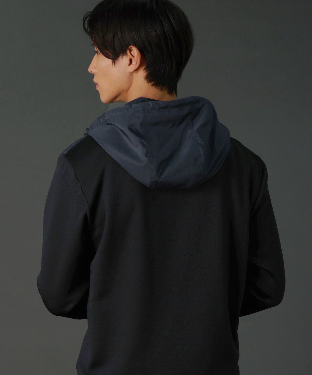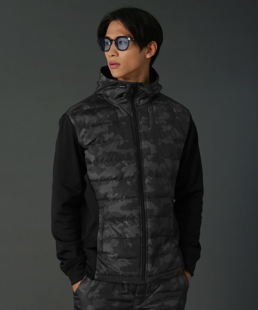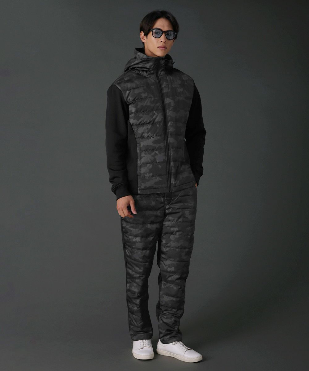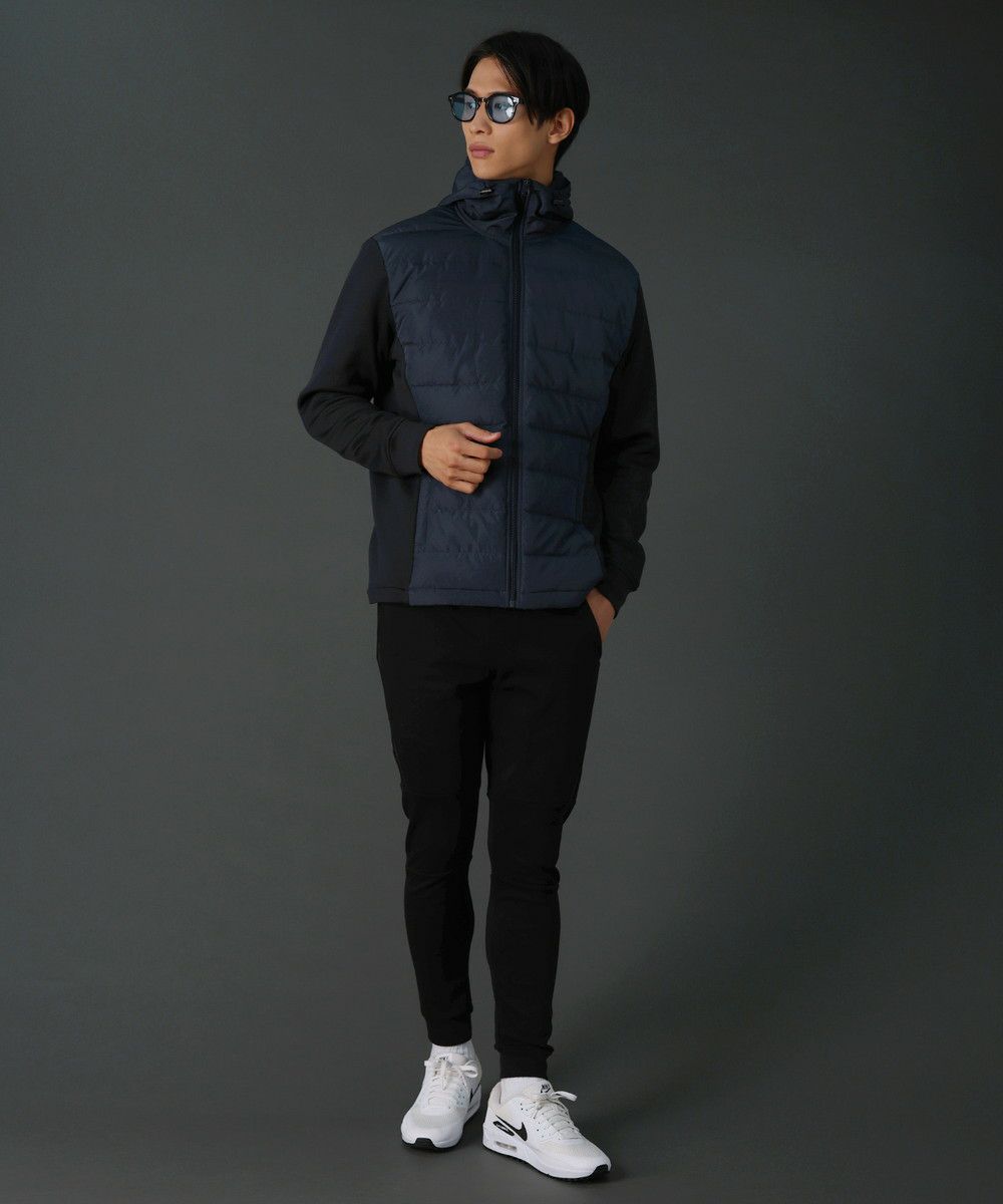 サイドに切り替えデザインを入れ、前身頃だけにダウンフェザーを入れることですっきりとした細身のシルエットを完成させています。袖と後ろ身頃にはストレッチ性の高いジャージー生地を採用。背中・肩・肘と抜群の伸縮性を発揮するのでゴルフでの着用にもおすすめです。上からさらにアウターを重ねれば、インナーダウンとしても活躍します。前身頃以外はフィット感の高いスマートなつくりで、アウターを羽織るときのごわつきも抑えられる設計に。アウターとしてもインナーとしても重宝する、着回しやすいデザインです。