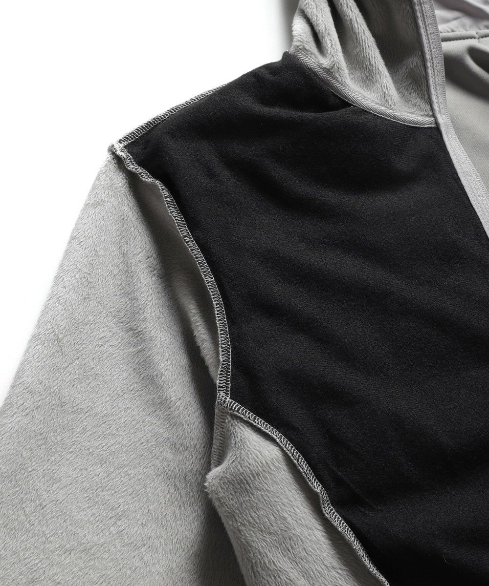 ダウンによる暖かさだけではなく、裏側にも暖かくなる工夫があります。ダウンが詰まっている前身頃側の裏地にはソフトな肌触りのフリース生地を採用。そして袖、後ろ身頃、フードの生地の裏面はふわふわのボア調に仕上げました。空気をため込みやすいフリースとボアで温もりを保ち、羽織るのが楽しみになるような温かみのある着心地を実現しています。フリースとボアは袖の先~裾までしっかり敷き詰められているので、一般的なカットソーの上から羽織るだけでもポカポカです。