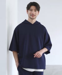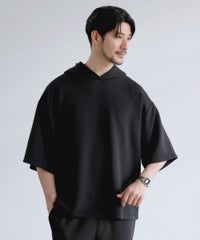 Tシャツ感覚で被って着るだけでお洒落な装いに仕上がる夏用半袖プルパーカー。カジュアルなイメージが強いパーカーアイテムですが、大人のキレイめコーデに馴染むように品の良いハイポンチ生地で仕立てました。子どもっぽい印象になってしまわないよう、袖は肘が隠れる長めの半袖丈に設計。ゆったりとしたシルエットのプルパーカーらしい楽な着心地で、気張らない抜け感のあるコーデが楽しめます。同ハイポンチ生地シリーズのパンツと組み合わせてセットアップにすることも可能です。