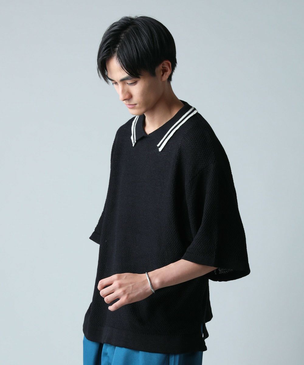 襟に入った配色ラインがアクセントの鹿の子編みポロシャツ。ナチュラルさとクラシカルな雰囲気で、上品なスタイリングにマッチする一着です。ゆったりとした身頃やドロップショルダーデザインなど、トレンドらしさも押さえ、合わせるだけでおしゃれな印象に決まります。浅めのサイドスリットで抜け感もプラス。カラーはベーシックなブラックやアイボリー、深みのあるカーキ、爽やかなトーンのサックスブルー。どのカラーも合わせやすく、上品な印象を与えてくれます。