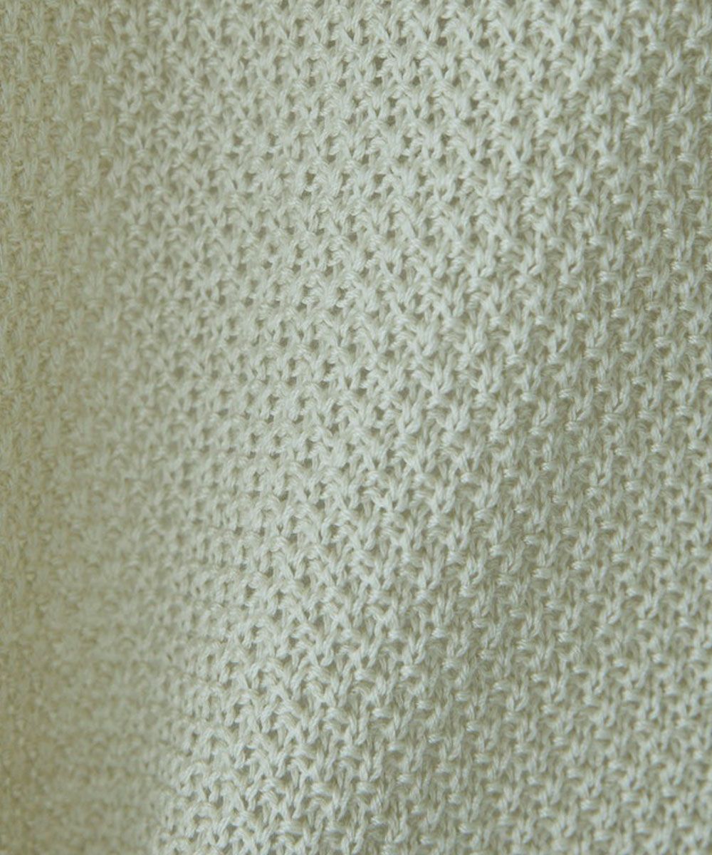 凹凸と透け感のある鹿の子編みニットを使用。表面のさり気ない凹凸と程よい透け感が、シーズンらしさと着たときに肌にまとわりつかない快適さを併せ持っています。ポリエステル100%でさらっとしたタッチと軽い着心地が特徴です。