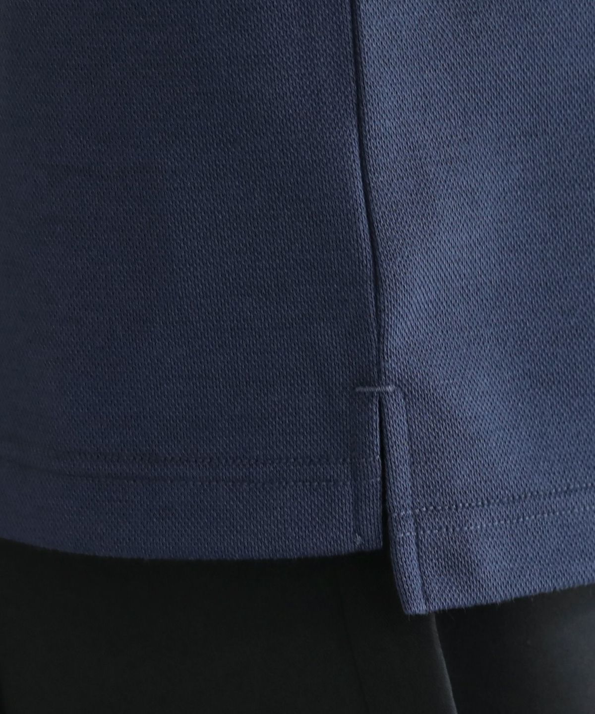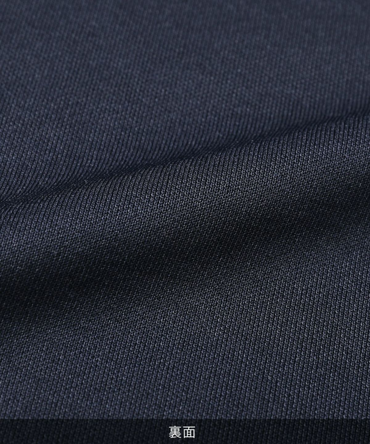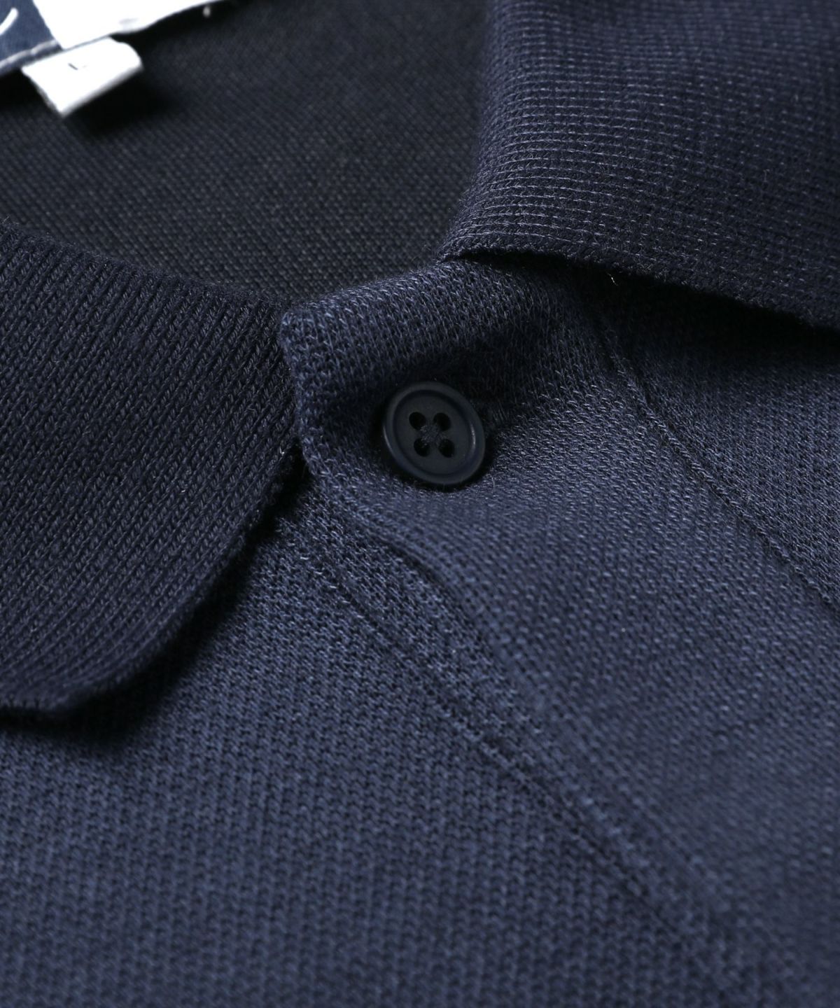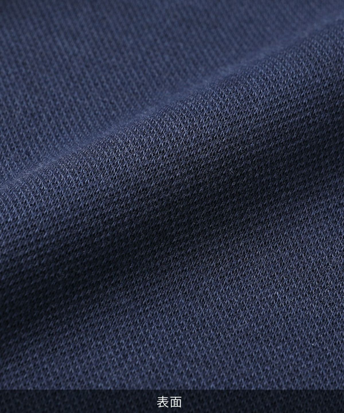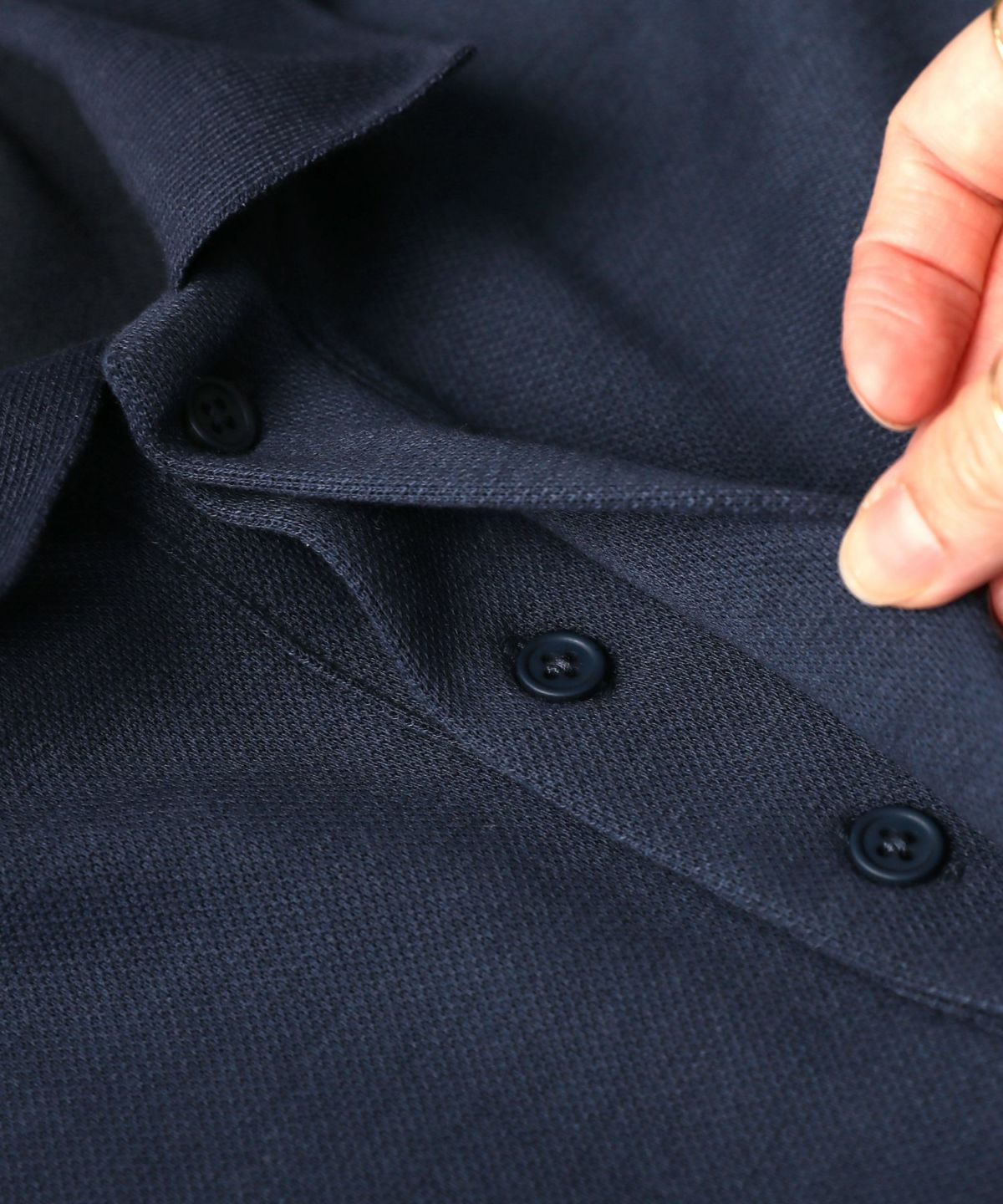 表面と裏面とで編み方が異なる、ダブルフェイス生地を用いました。表面はポロシャツらしい細かな鹿の子編みに、裏面は一般的なカット地のような編み方になっております。ダブルフェイス生地は表と裏が別の編み方になるため、通常の生地に比べて厚みが増すのが特長。このように生地に厚みを出すことで、チープな印象になることを防ぎ、上質な雰囲気のポロシャツへと仕上げております。