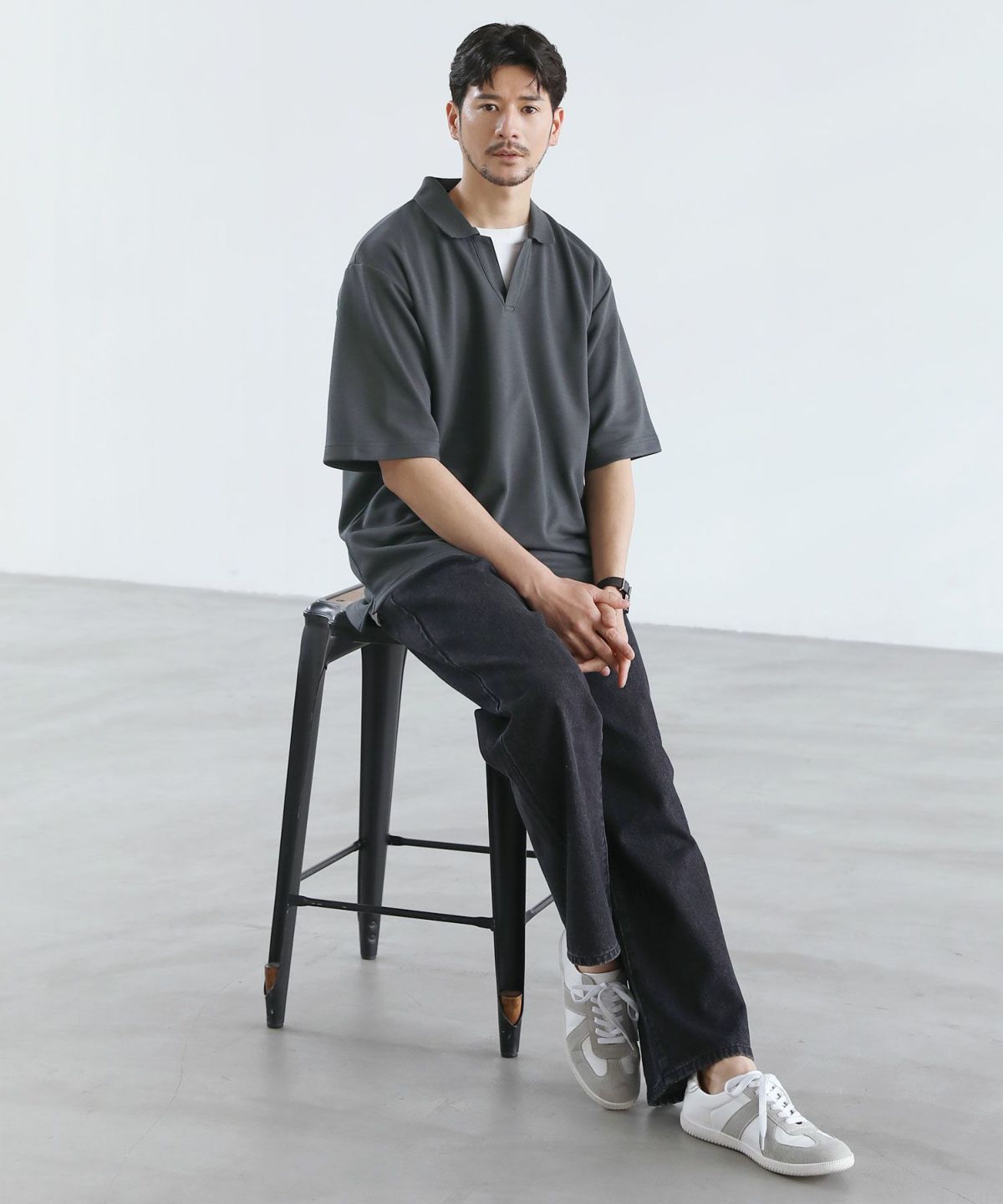 ひんやりとした着心地を体感できる接触冷感スキッパーポロシャツです。身幅と腕ぐりにたっぷりとゆとりを持たせ、動きやすくルーズな旬のシルエットに仕上げました。通常のポロシャツと違い、胸元のボタンを取り除いたスキッパースタイルにすることで胸元に自然な抜け感をプラスしています。また、抗菌防臭機能と接触冷感機能を併せ持った特殊な生地を使用。オンにもオフにも活躍する汎用性の高いデザインで、汗ばむ夏のシーズンでも涼しく清潔にご着用いただけます。
