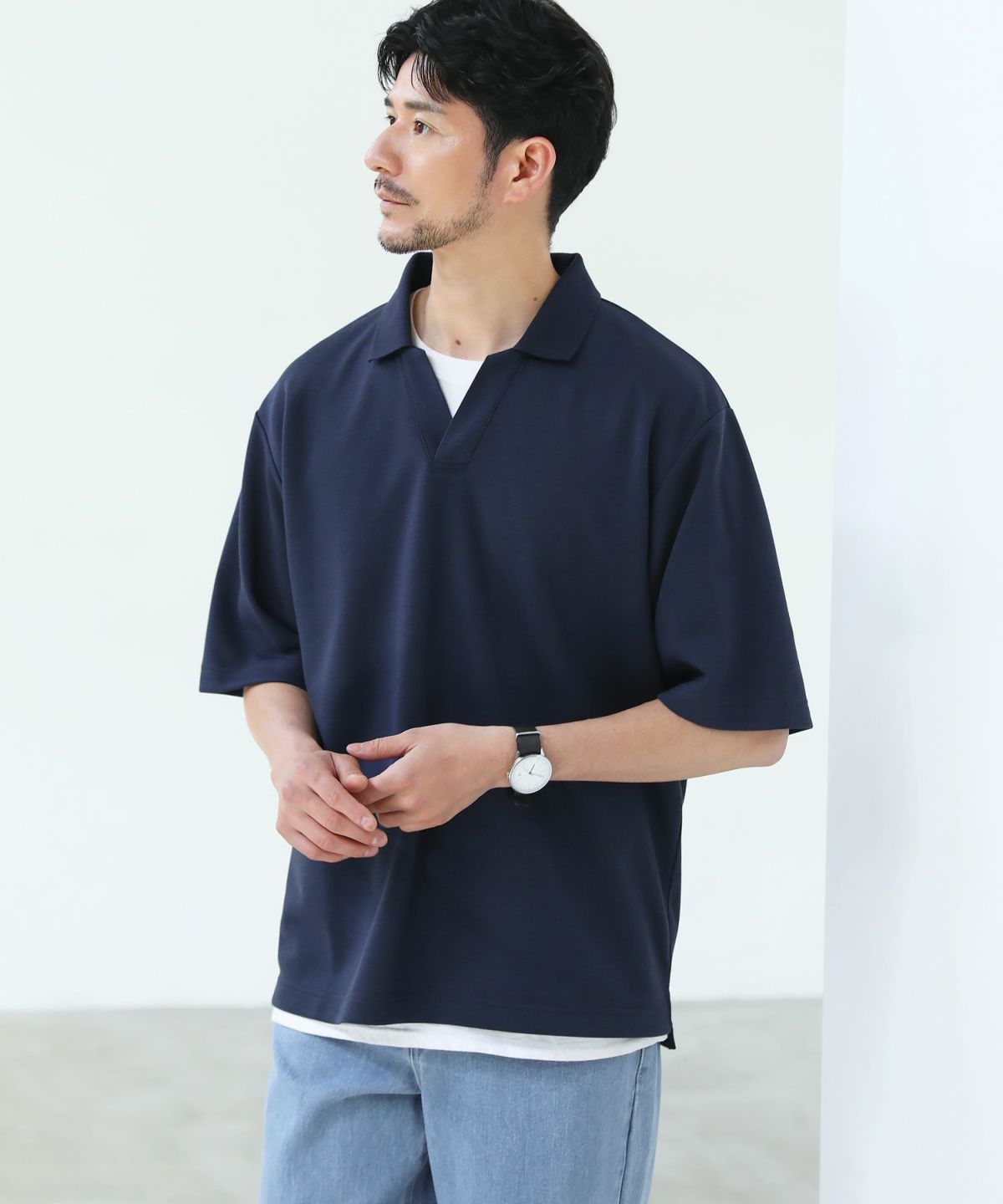 ひんやりとした着心地を体感できる接触冷感スキッパーポロシャツです。身幅と腕ぐりにたっぷりとゆとりを持たせ、動きやすくルーズな旬のシルエットに仕上げました。通常のポロシャツと違い、胸元のボタンを取り除いたスキッパースタイルにすることで胸元に自然な抜け感をプラスしています。また、抗菌防臭機能と接触冷感機能を併せ持った特殊な生地を使用。オンにもオフにも活躍する汎用性の高いデザインで、汗ばむ夏のシーズンでも涼しく清潔にご着用いただけます。
