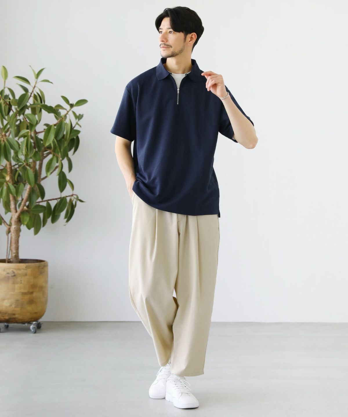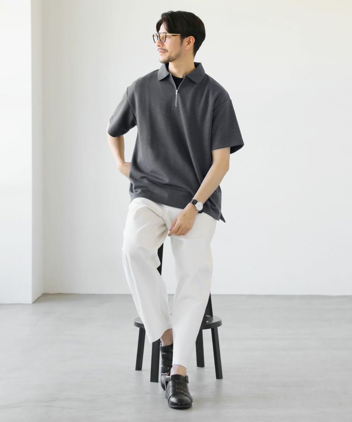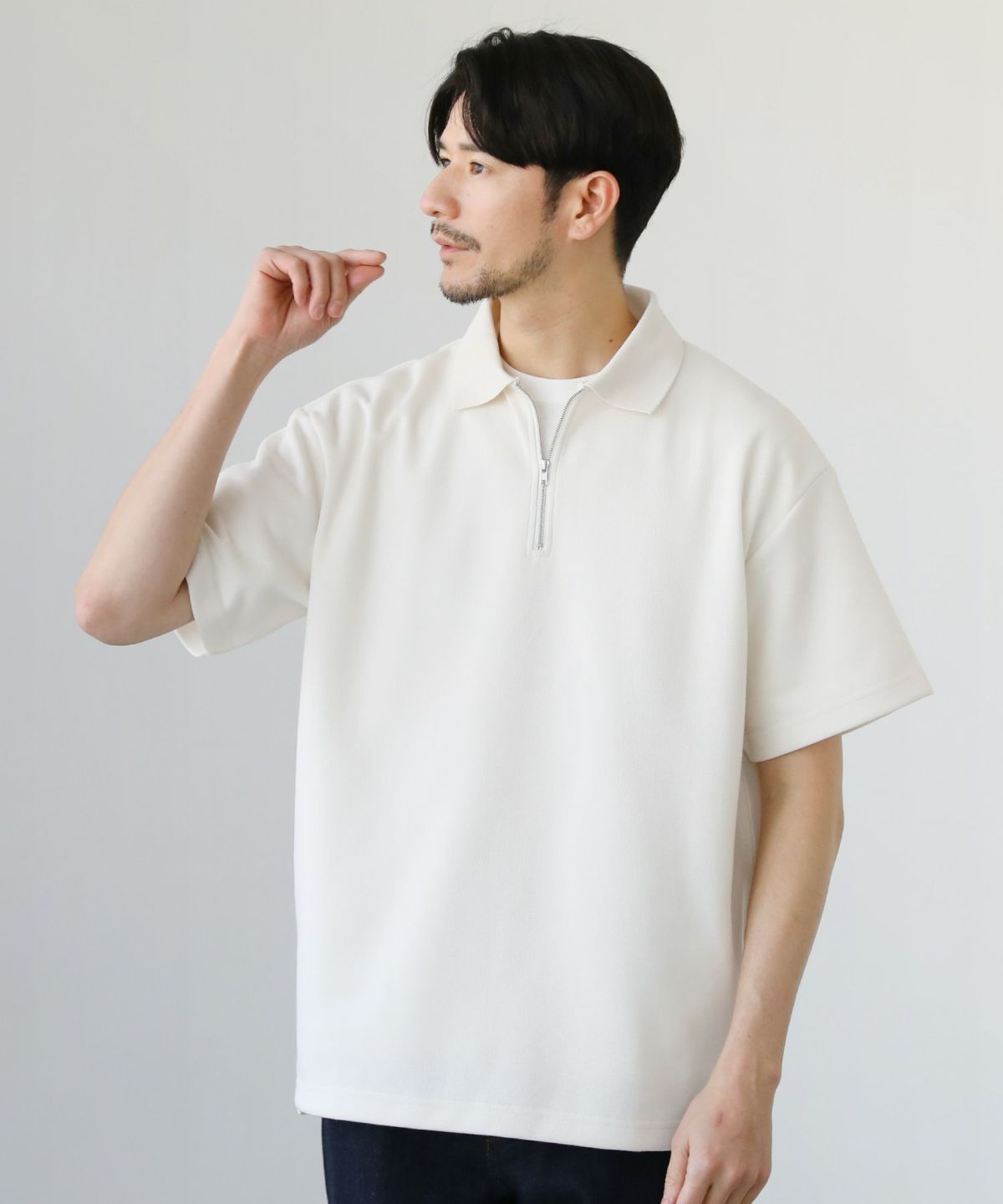 コーディネートに抜け感をプラスしてくれるハーフジッププルオーバー。ジップの開け具合でインナーとのレイヤードも楽しむことができ、着こなしの幅を広げてくれる一着です。素材には抗菌防臭機能と接触冷感機能を併せ持った特殊な生地を用いているので、汗ばむ季節の中でも涼しく清潔にご着用いただけます。サイズにゆとりを持たせており窮屈感のないラクな着心地で、ゆったりとしたルーズシルエットが簡単に今っぽい装いに仕上げてくれます。無駄がなく洗練されたデザインで、キレイめにもカジュアルにも合わせやすいアイテムとなっています。