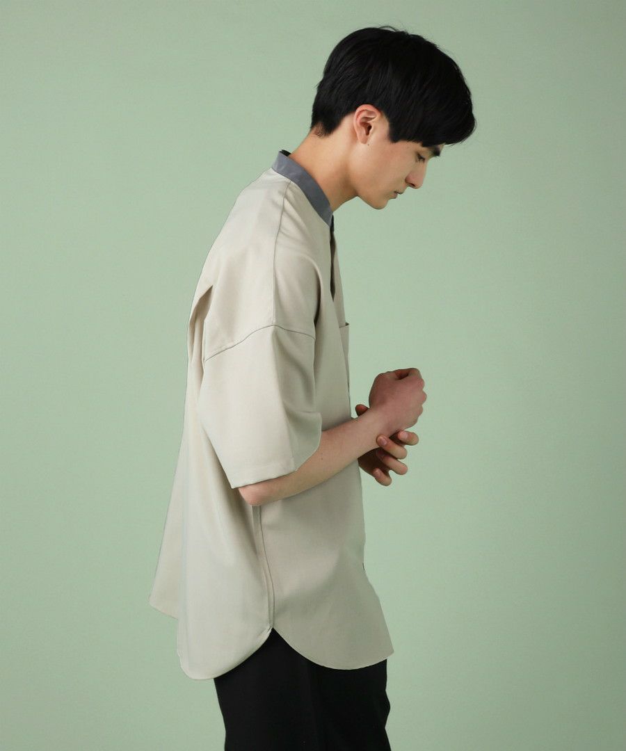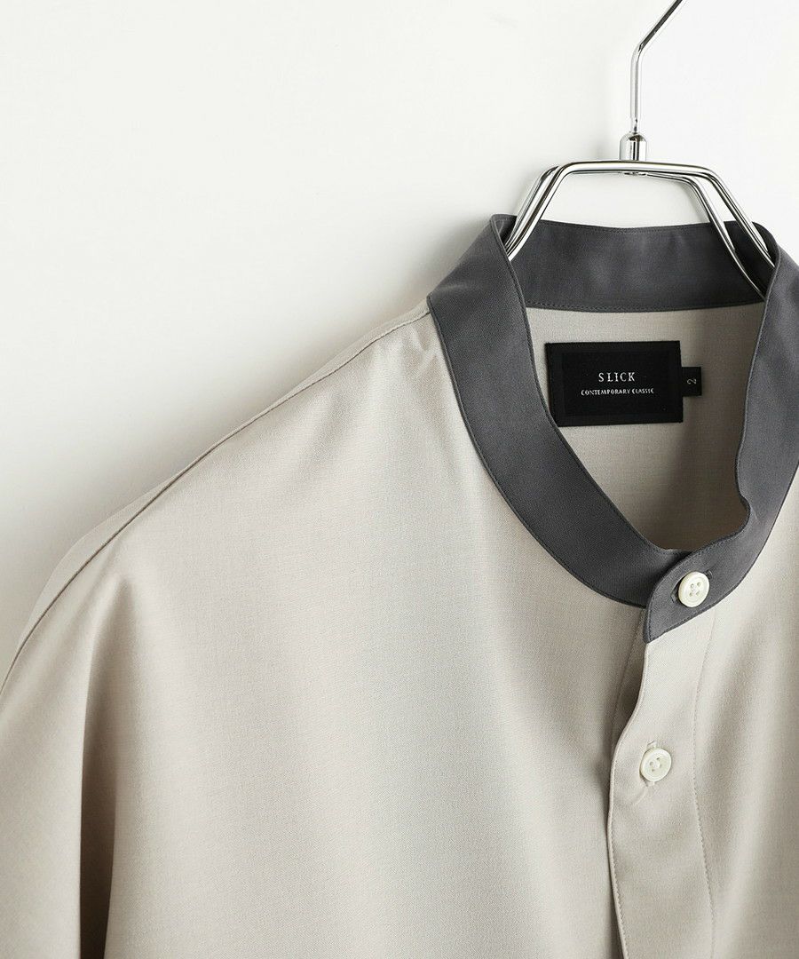 襟とボディで配色を変えたクレリック襟が特徴のオーバーサイズのバンドカラーシャツ。 素材感を生かすようにそぎ落としたミニマルなデザインですが、台襟の配色で単調になり過ぎない印象にまとめてくれます。 脇の縫い目は折伏せ縫いや、運針の細やかなステッチを採用したりと、縫製も丁寧に行った日本製です。