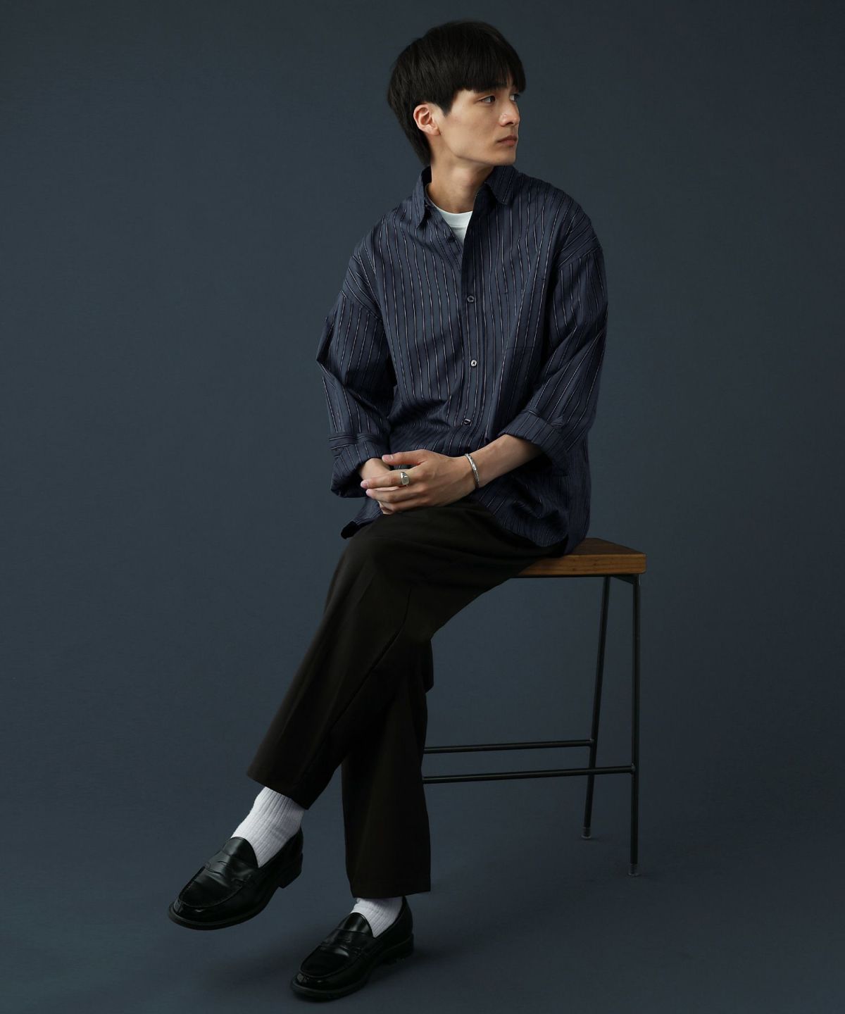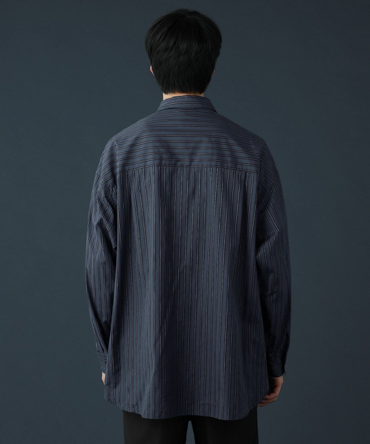 高級感のある100/2の糸を使用し、さりげない凹凸感のあるドビー組織で織られたストライプ生地で仕立てました。 素材感を生かすように削ぎ落とされたミニマルなデザインが特徴。ドロップショルダーや、広めに取った身幅が抜け感を作り出すオーバーサイズシャツです。
