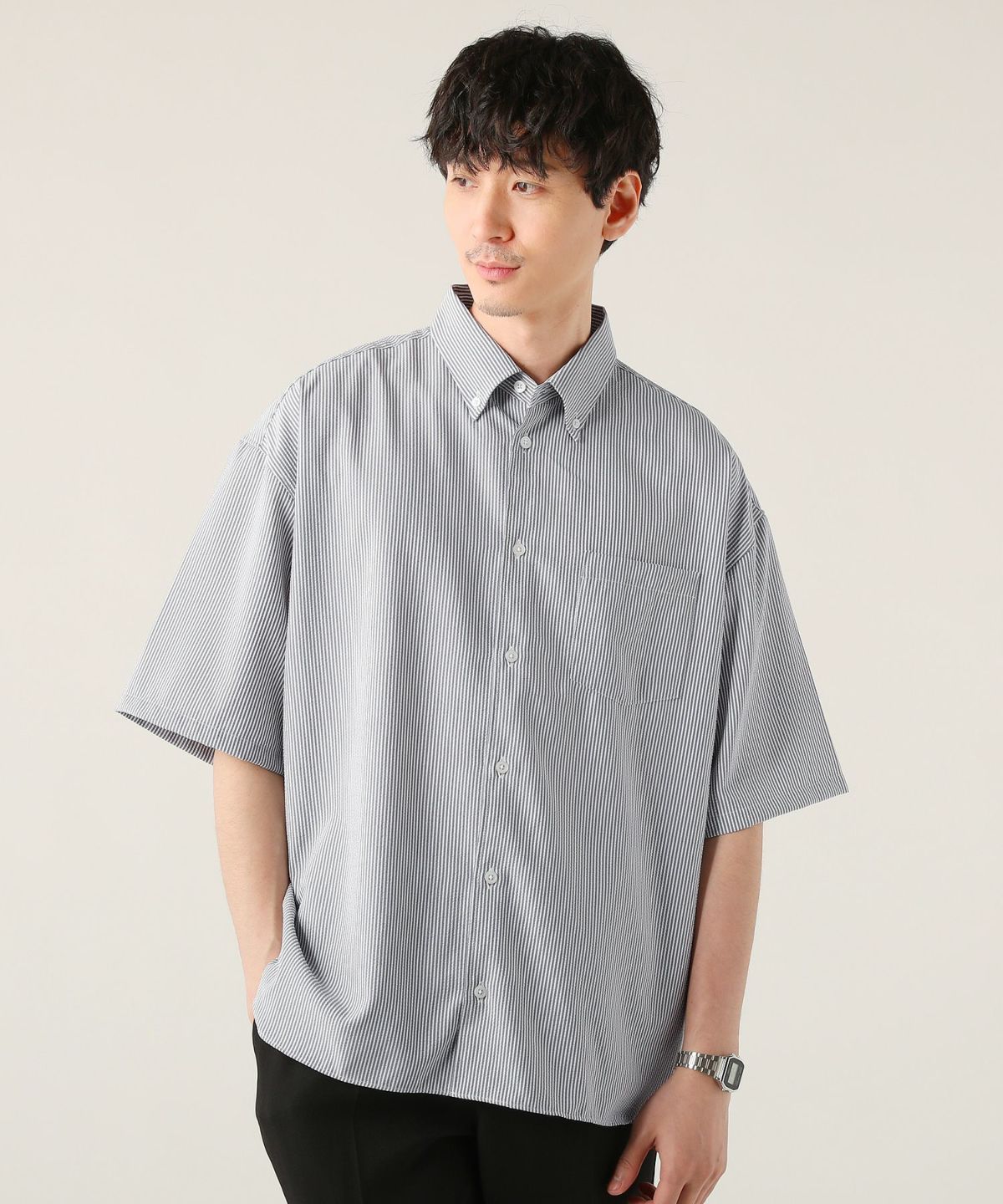 日本製ポリエステルサッカーストライプボタンダウンボクシーAラインハーフスリーブシャツ