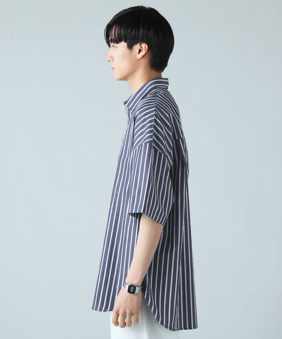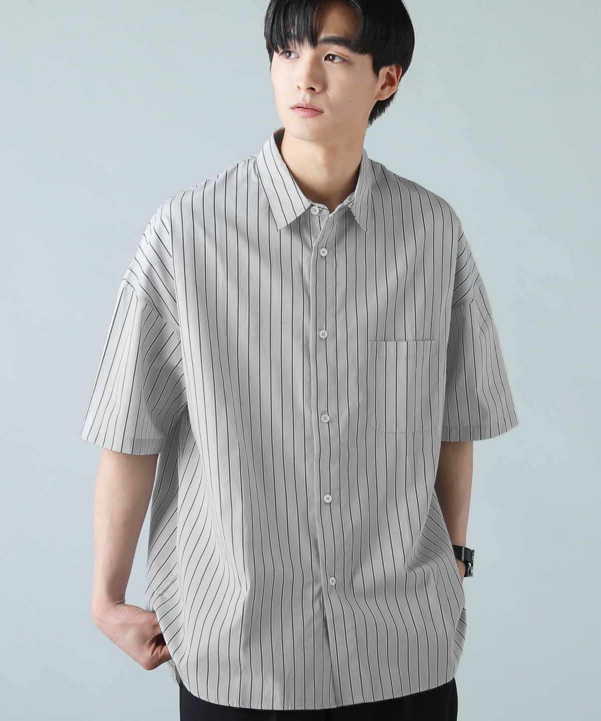 目の細かい高級感のある高密度のストライプ生地の素材感を生かすように削ぎ落とされたミニマルなデザインの半袖シャツ。 肩を落としたドロップショルダーデザインで、こなれ感たっぷりの雰囲気を作り出します。 丈夫になるよう脇の縫い目は折伏せ縫いに、さらに運針の細かなステッチを採用するなど、縫製にもこだわったアイテムです。
