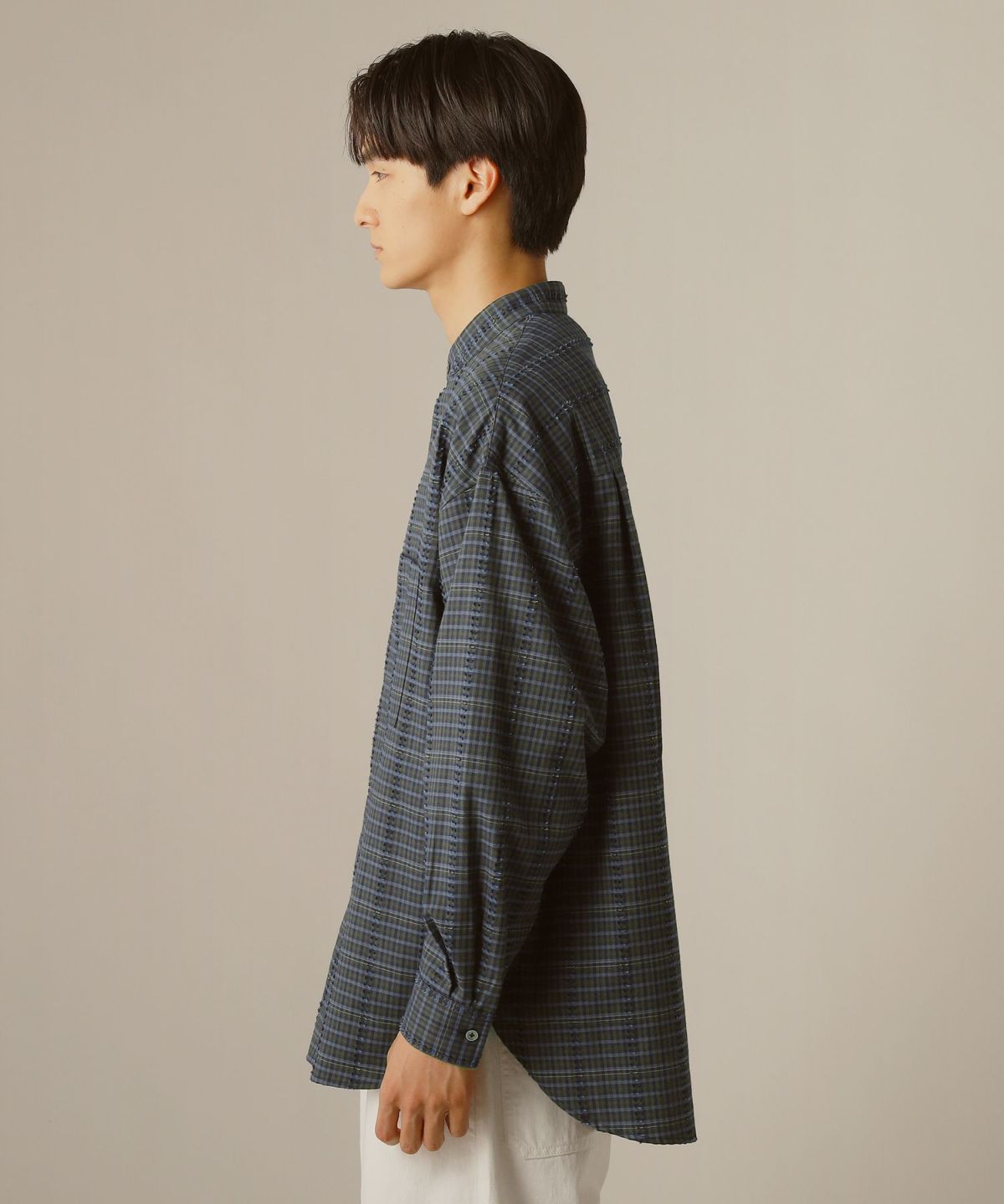 ドロップショルダーデザインとたっぷりワイドな身幅でオーバーサイズに設計しています。窮屈感がなく動きやすい着心地の良いシャツです。襟は堅苦しさを感じさせないバンドカラーを採用。キレイめながらもリラックス感のある着こなしをお楽しみいただけます。