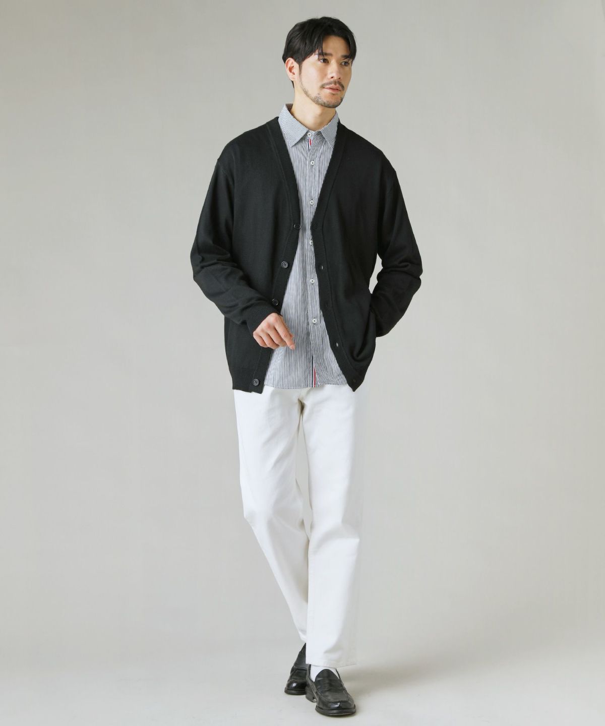 襟はキレイめにもカジュアルテイストにも合わせやすい、スタンダードなレギュラーカラーを採用しました。ボタンを開けたときに見える下前立ての配色ラインが、着こなしにお洒落なアクセントを添えます。ボタンにはブルーやグレーの付け糸を使用しており、細部にまでこだわったデザイン性が魅力です。さらに、前後差のある着丈がコーディネートに程よく抜け感をプラス。細身すぎない、ややゆとりを持たせたレギュラーシルエットで一枚着としてもインナーとしても使いやすいサイズ感となっております。