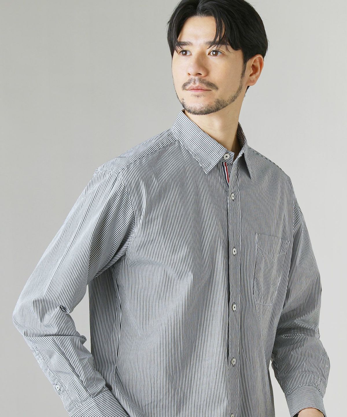 下前立てテープのトリコロールカラーがアクセントになった日本製の長袖シャツです。
