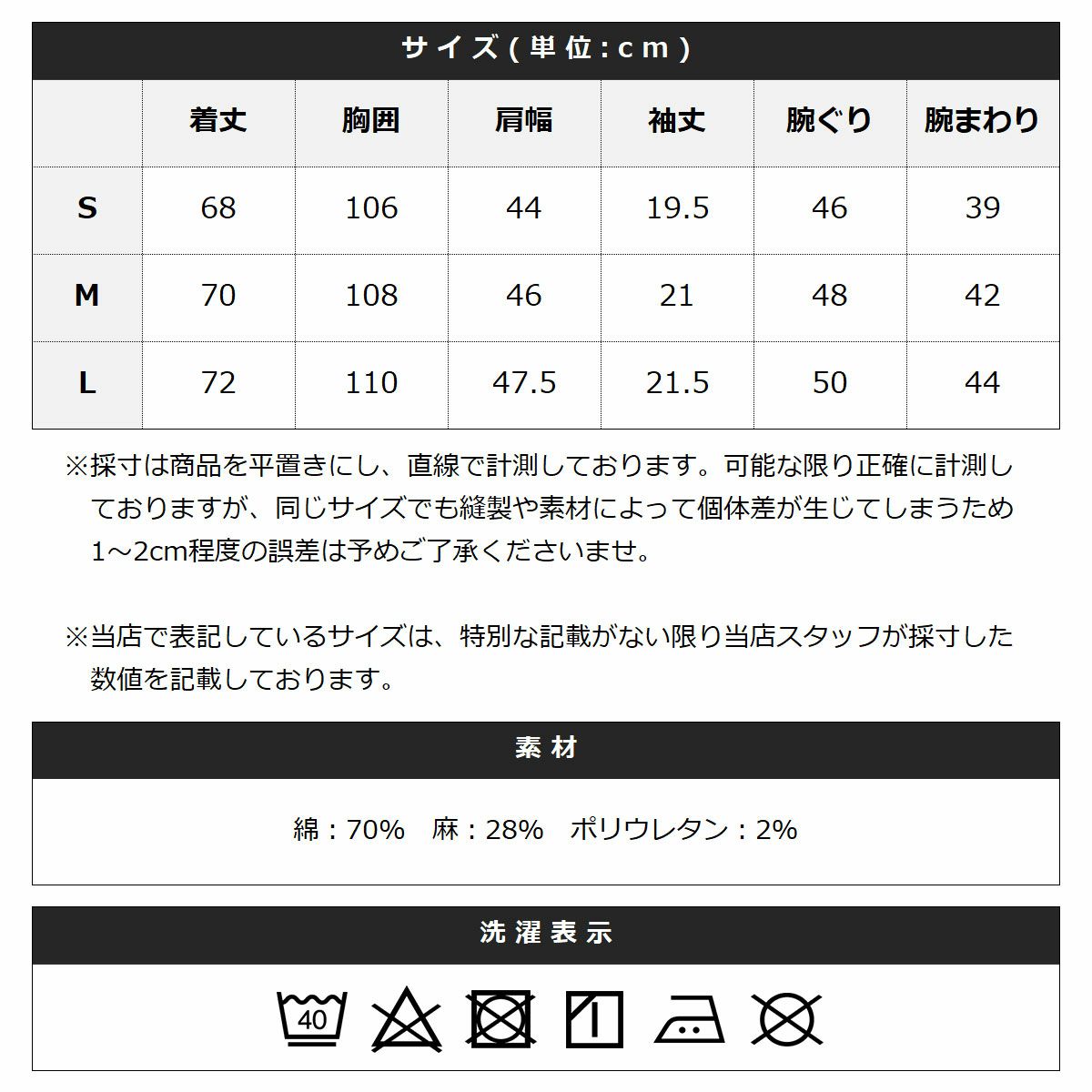- 綿:70% 麻:28% ポリウレタン:2%