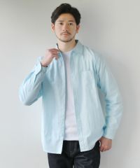 不規則な節を持つスラブ糸で織られた、表情のあるスラブ布帛生地を採用しています。陽にかざすと分かるような程よい透け感がある生地です。薄手な生地のため素肌の上から一枚で着用することには向いていませんが、汗ばむ季節の外出時の羽織りとして・冷房が効いた室内での体温調節用としても重宝します。ご自宅でもお洗濯が可能な綿ポリ混紡素材で日常的に着回しやすいシャツです。