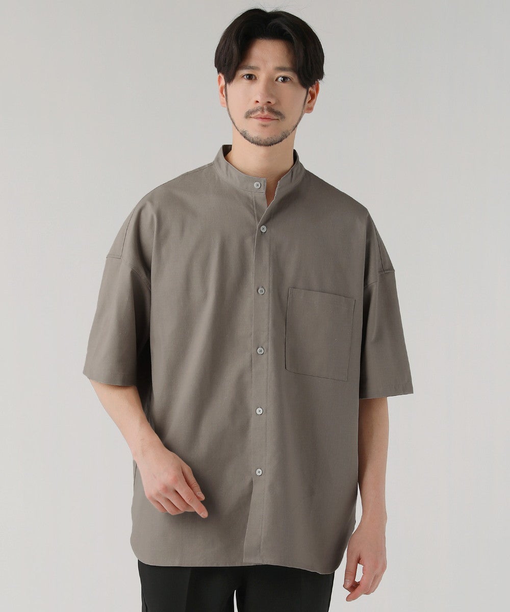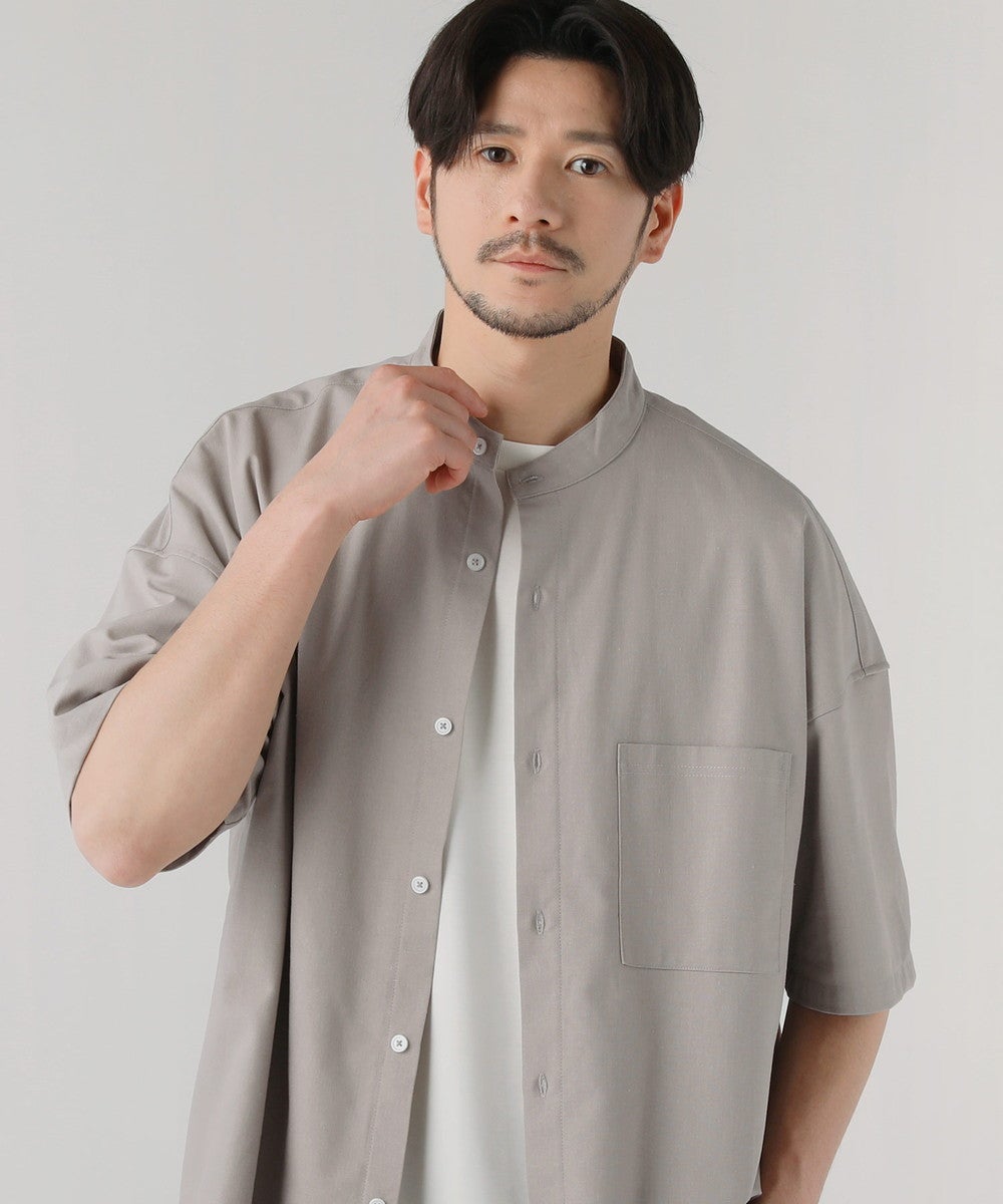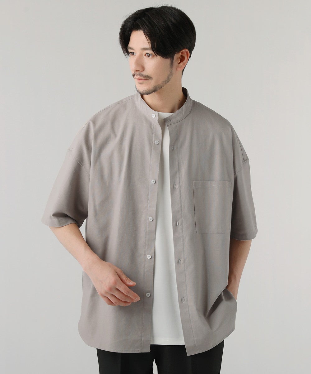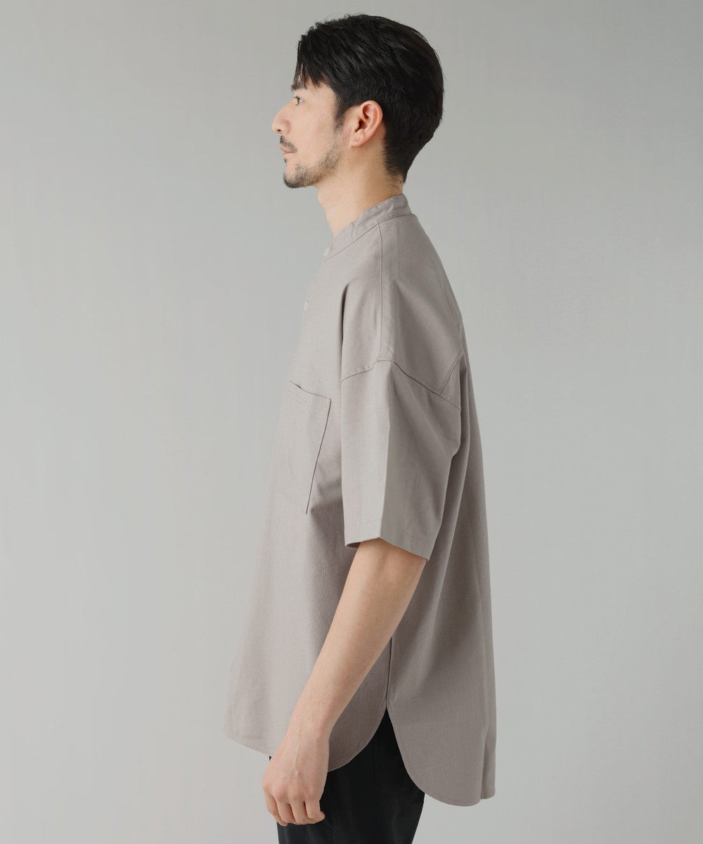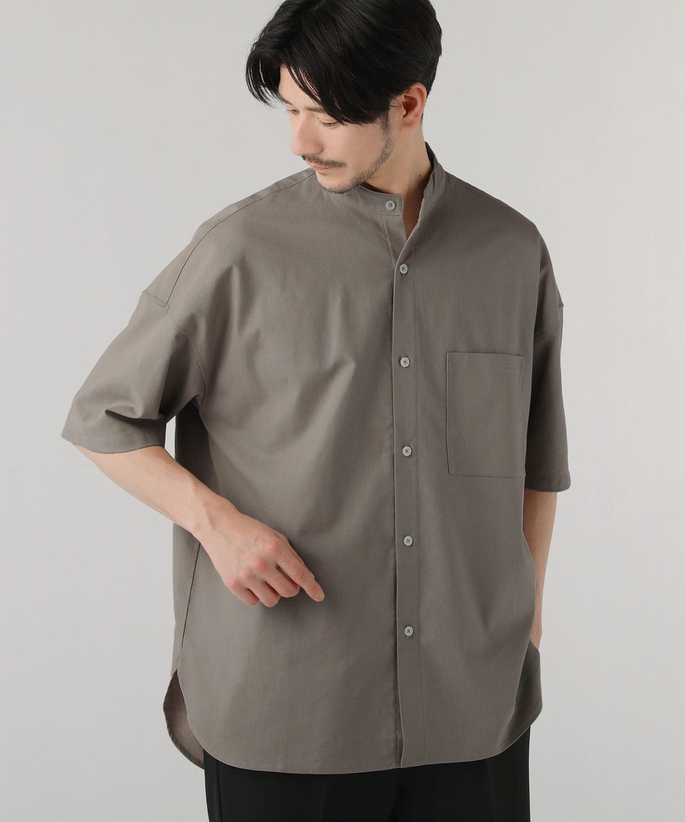 肘にかかる半袖の丈感、ゆとりのある身幅など、リラックス感のあるシルエットが特徴的。上襟のないバンドカラーは顔周りをシャープに見せるため、程よい品格をプラスしてくれます。左胸のポケットもアクセントに。丸みを帯びたラウンドヘムには前後差を出して、おしゃれ度をアップさせています。