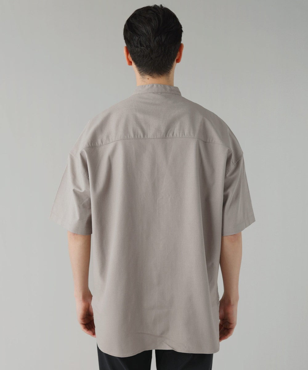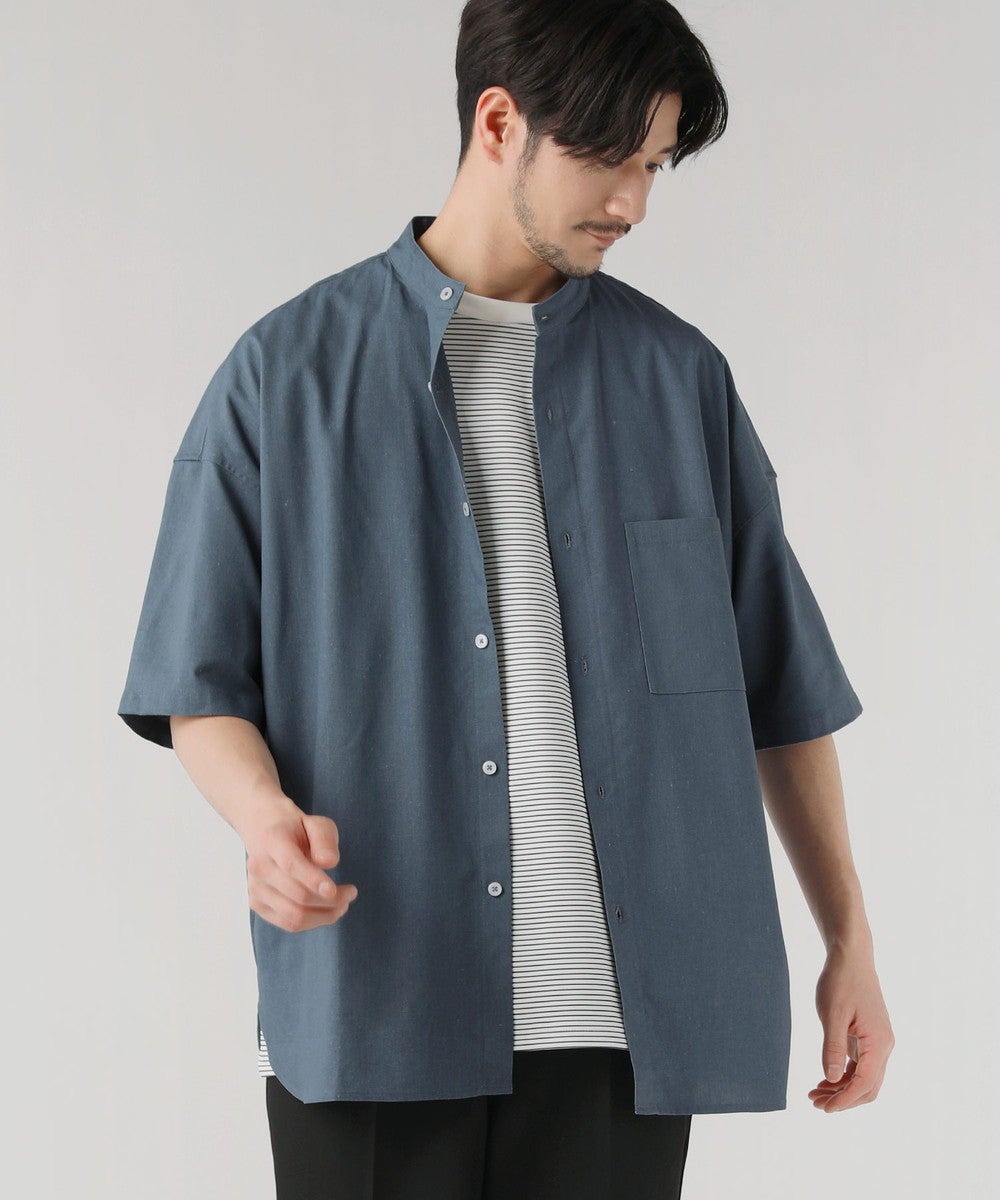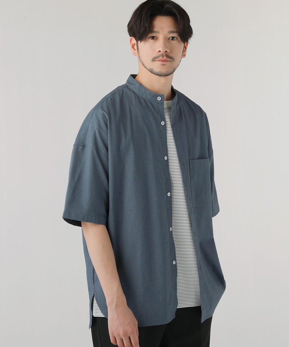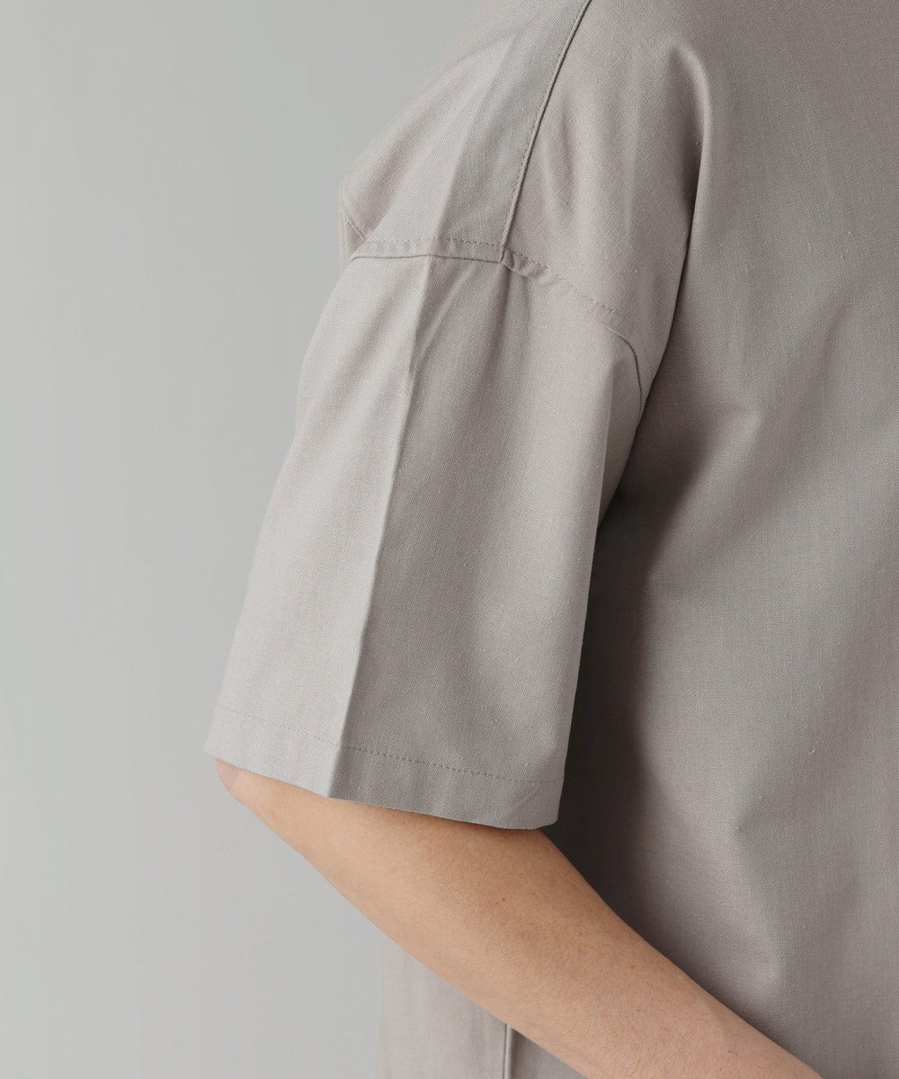 肘にかかる半袖の丈感、ゆとりのある身幅など、リラックス感のあるシルエットが特徴的。上襟のないバンドカラーは顔周りをシャープに見せるため、程よい品格をプラスしてくれます。左胸のポケットもアクセントに。丸みを帯びたラウンドヘムには前後差を出して、おしゃれ度をアップさせています。