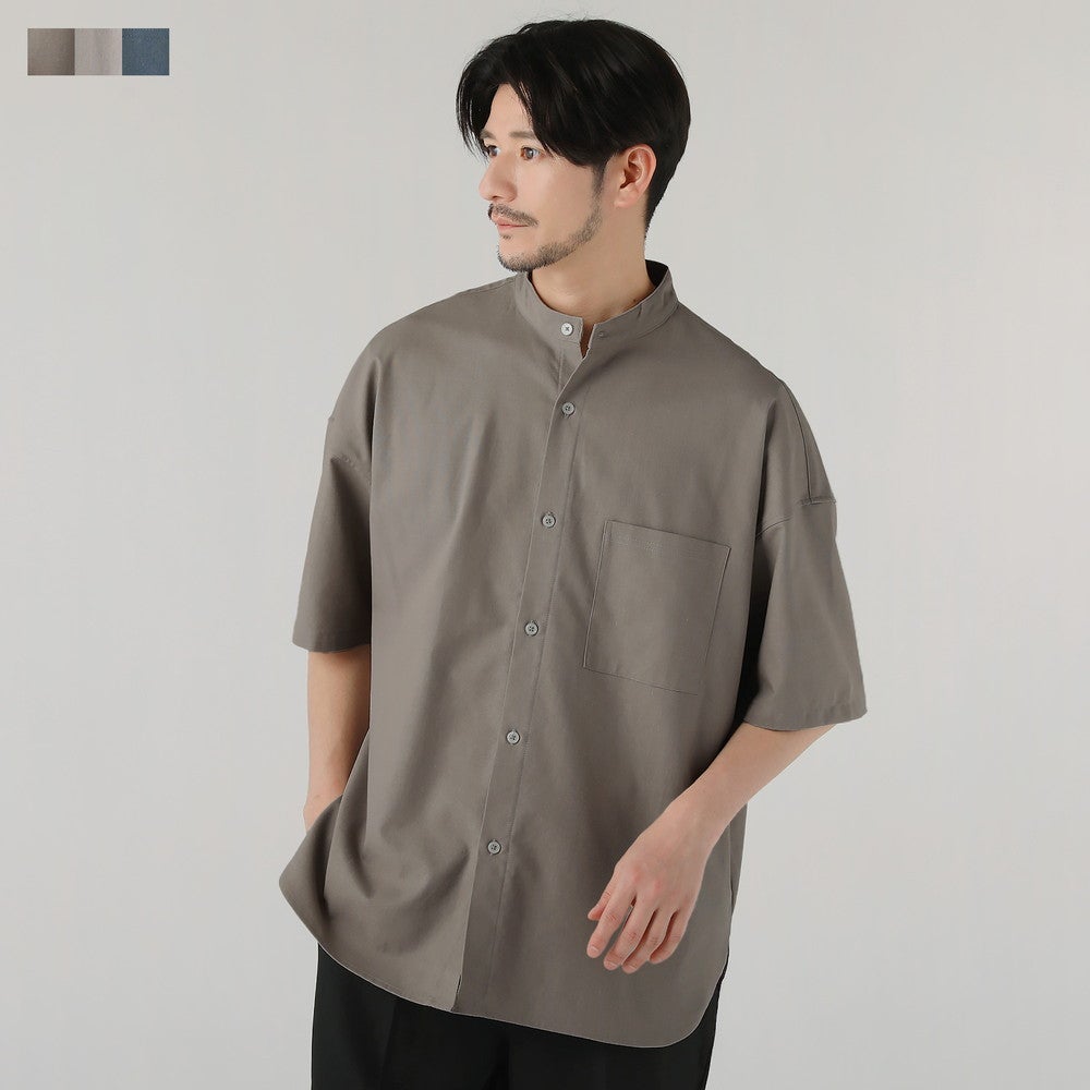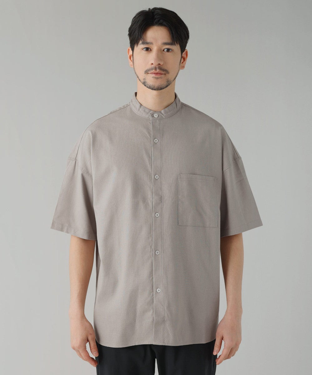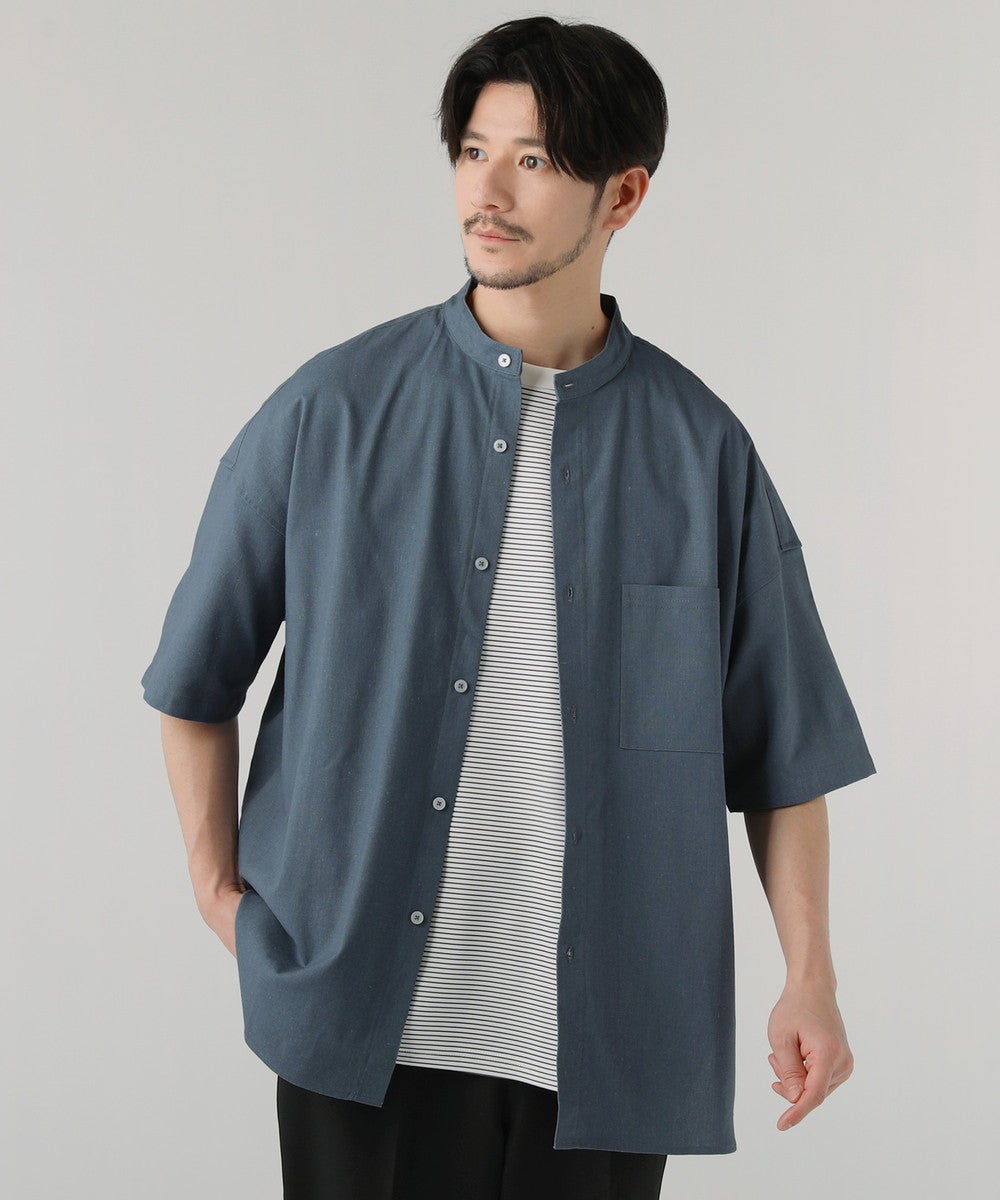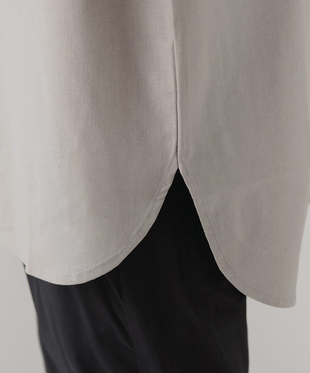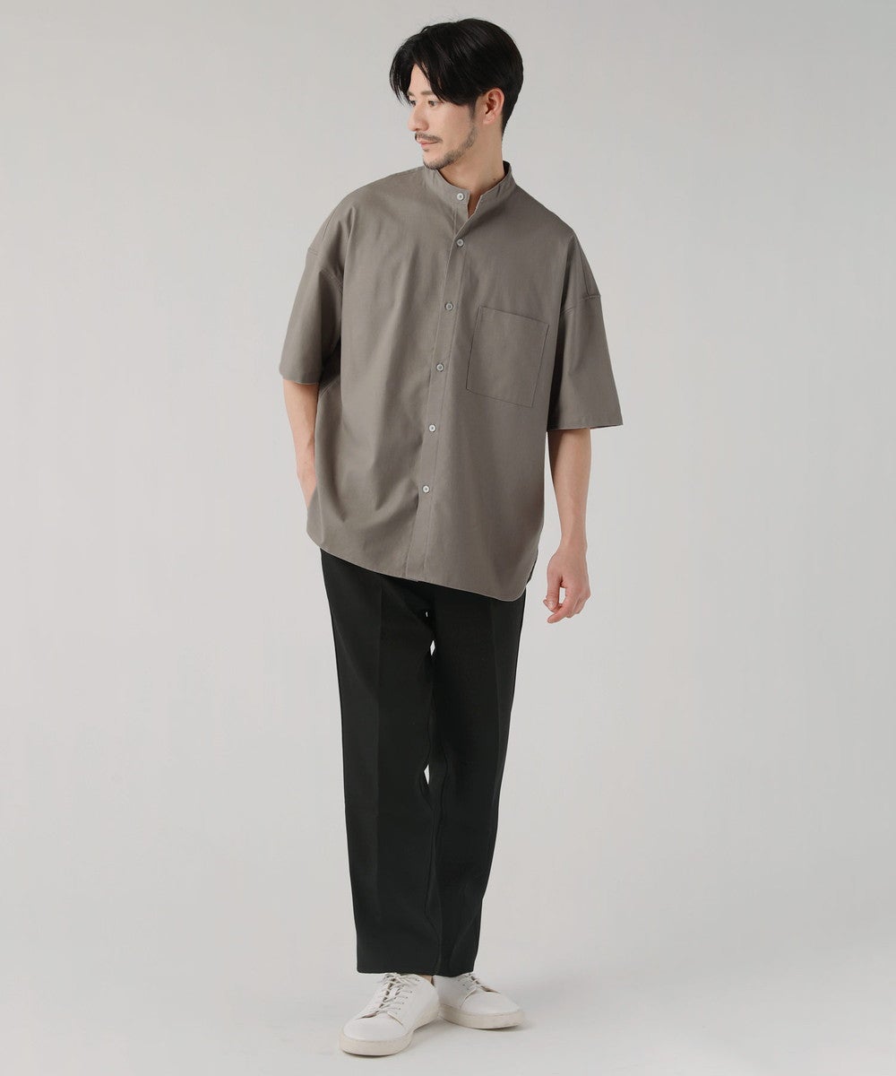 肘にかかる半袖の丈感、ゆとりのある身幅など、リラックス感のあるシルエットが特徴的。上襟のないバンドカラーは顔周りをシャープに見せるため、程よい品格をプラスしてくれます。左胸のポケットもアクセントに。丸みを帯びたラウンドヘムには前後差を出して、おしゃれ度をアップさせています。
